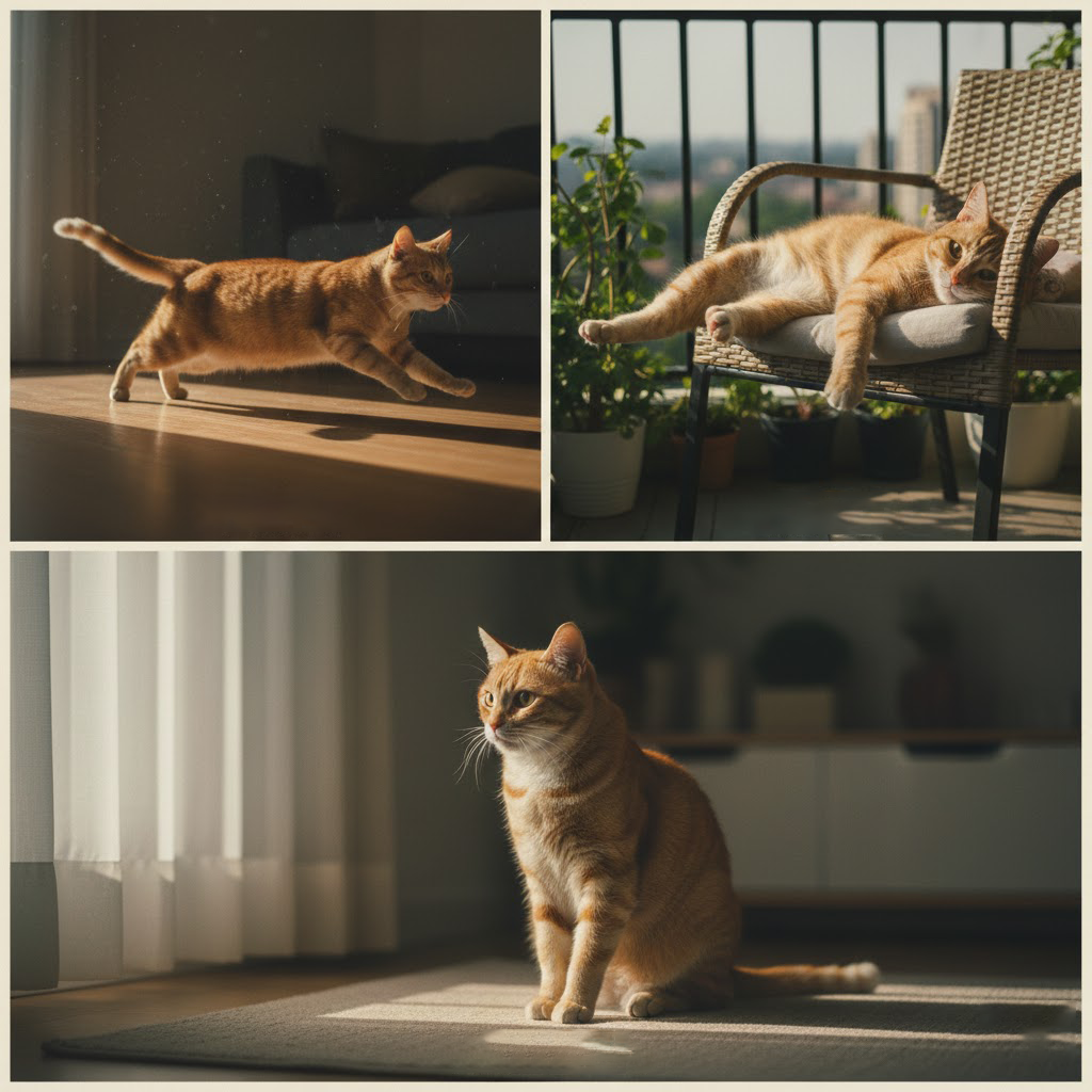 - 画面1:凌晨3点猫在客厅狂奔 文案:这是你想我想得睡不着的一天(虽然我在睡觉)