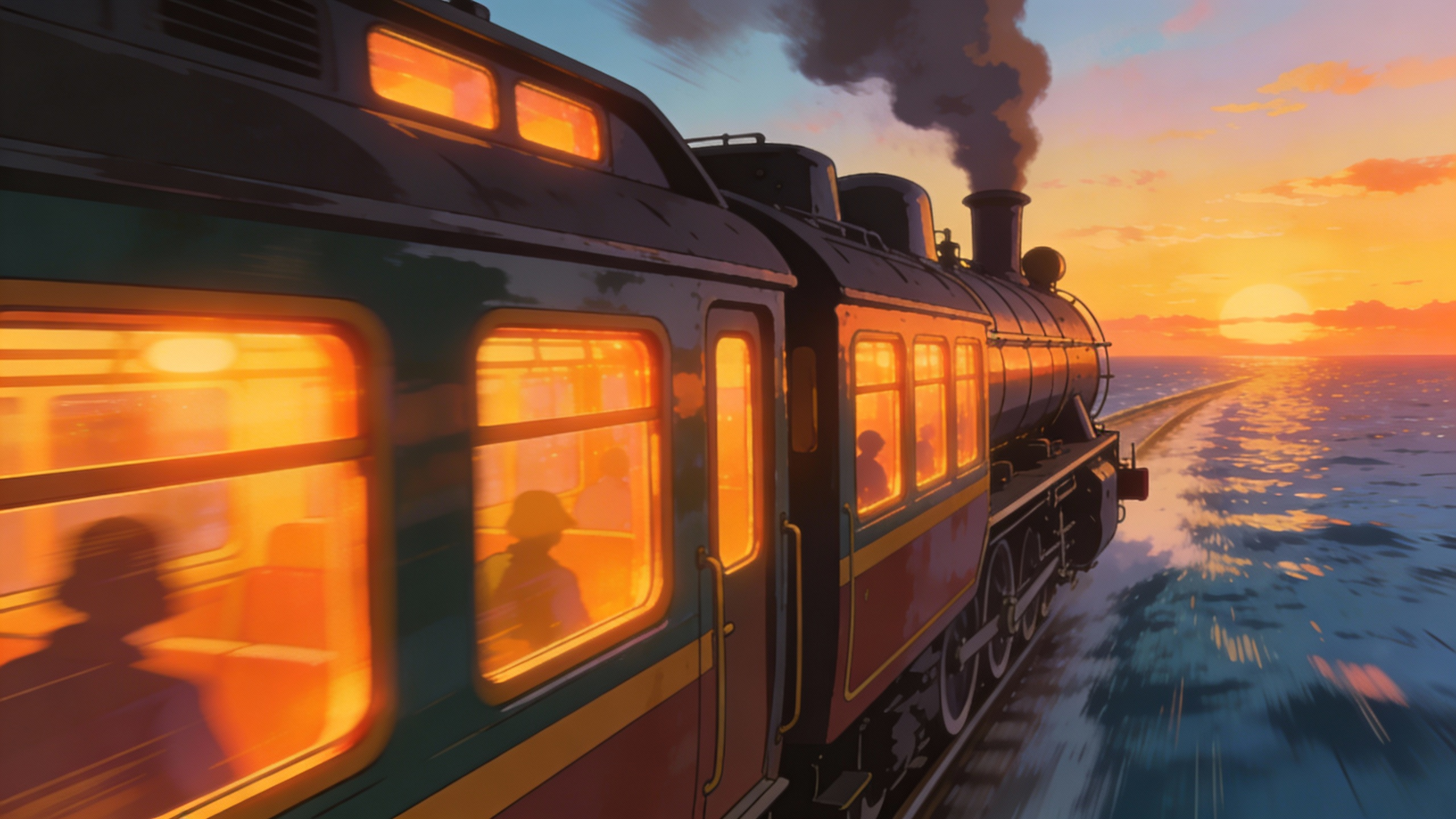 吉卜力工作室风格,中景镜头。蒸汽火车的侧面特写,火车正在飞驰。透过车窗可以看到车内温暖的橘黄色灯光,有人影若隐若现。背景是快速掠过的海面和远处的夕阳,画面带有轻微的动态模糊感,色彩饱和度高,充满希望的感觉。