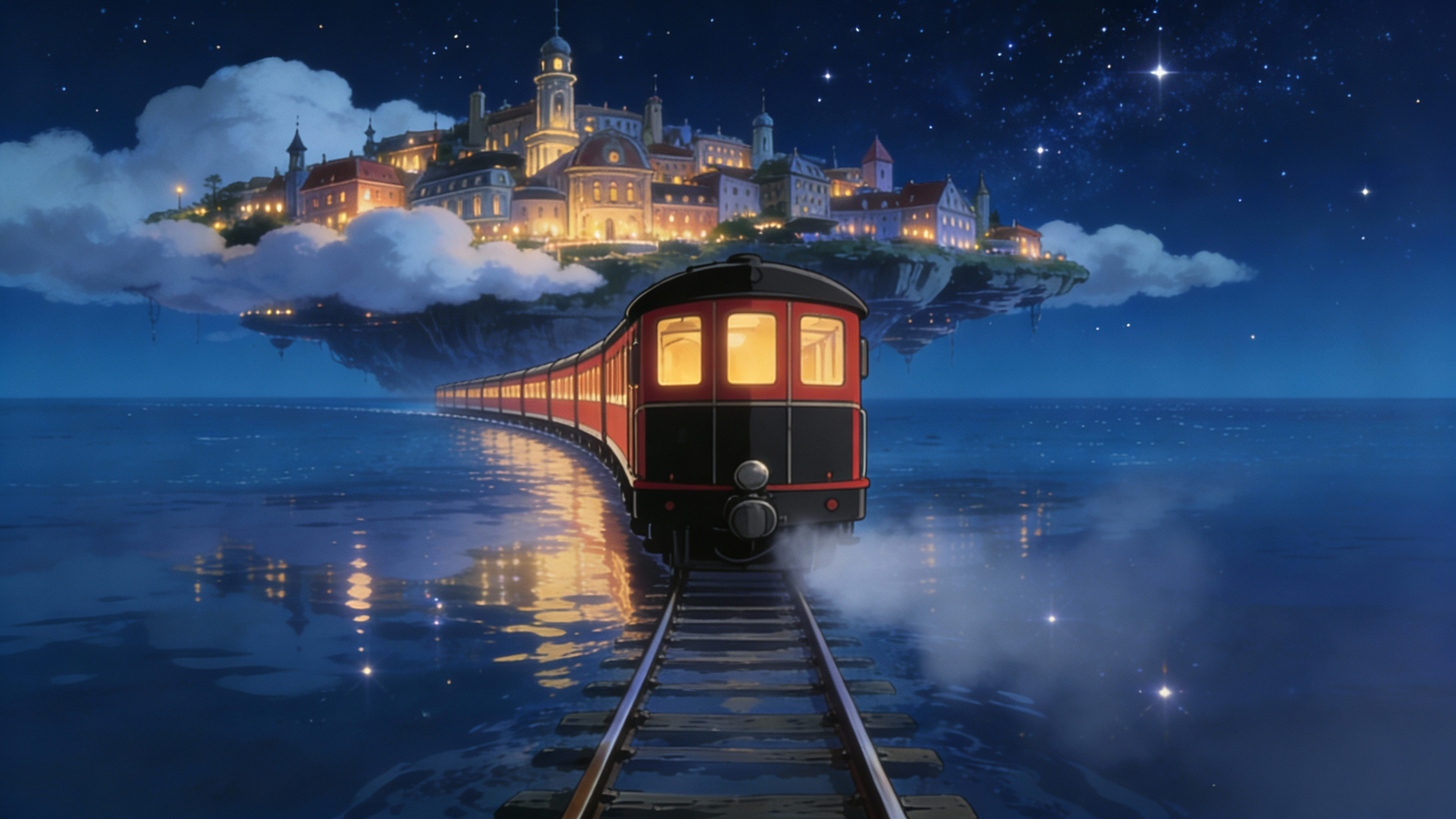 镜头从远景向悬浮小镇渐进,焦点始终锁在小镇暖光建筑群上,小镇灯火如碎钻轻闪,屋顶轮廓随推镜逐渐清晰;海面倒影因微波缓缓漾开,将小镇光斑晕成柔润光带;火车沿铁轨向小镇方向移动,车身渐融入夜色,仅车尾暖灯与小镇光团呼应;画面光线随镜头推进缓慢柔化、暗调收尾,以静谧的 “驶向终点” 感,衬出童话结局的余韵与想象空间。