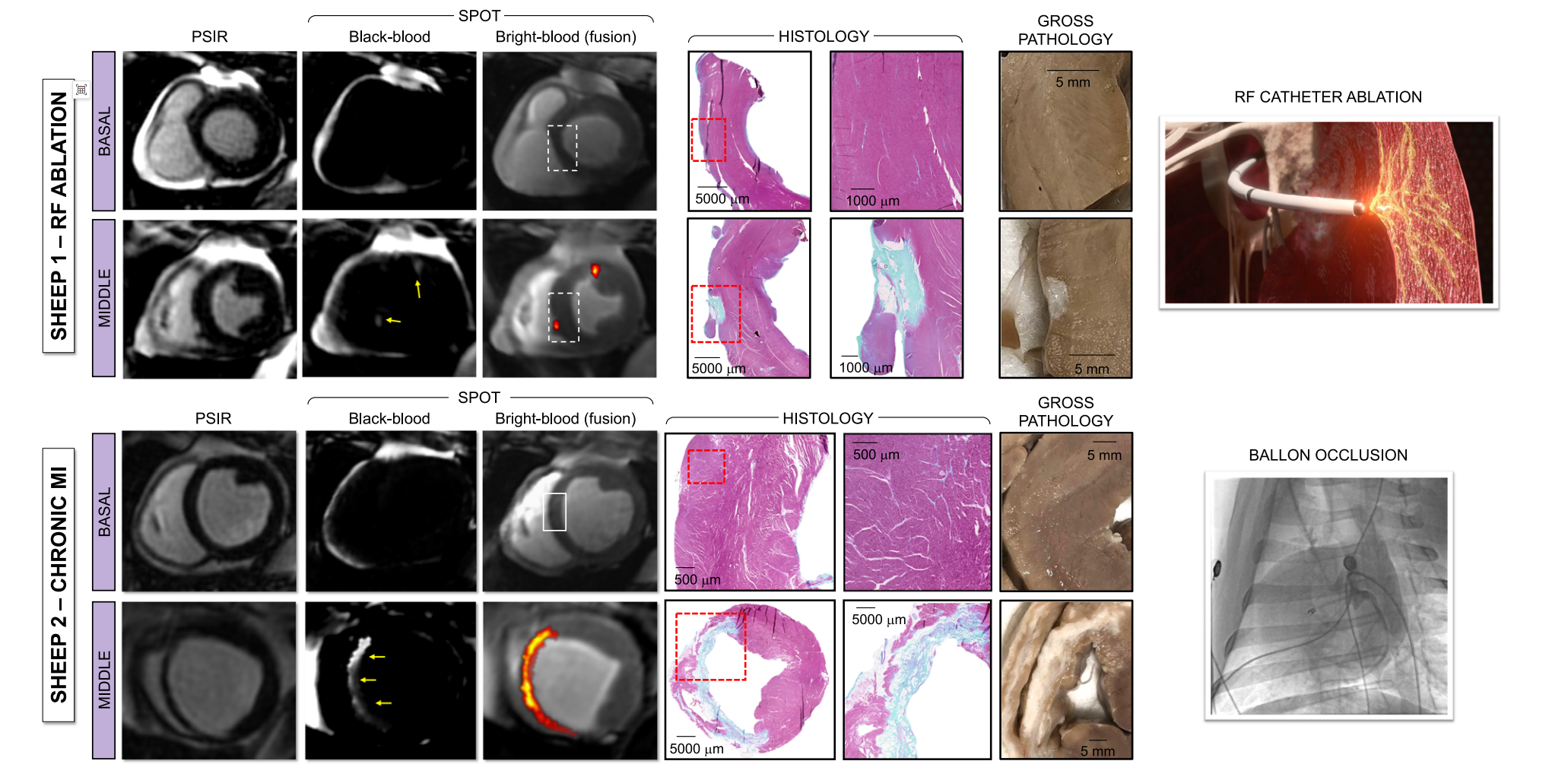 图3:传统PSIR难以分辨的微小瘢痕(黄色箭头),在SPOT黑血图像中一目了然