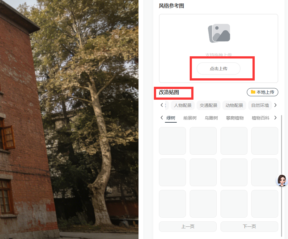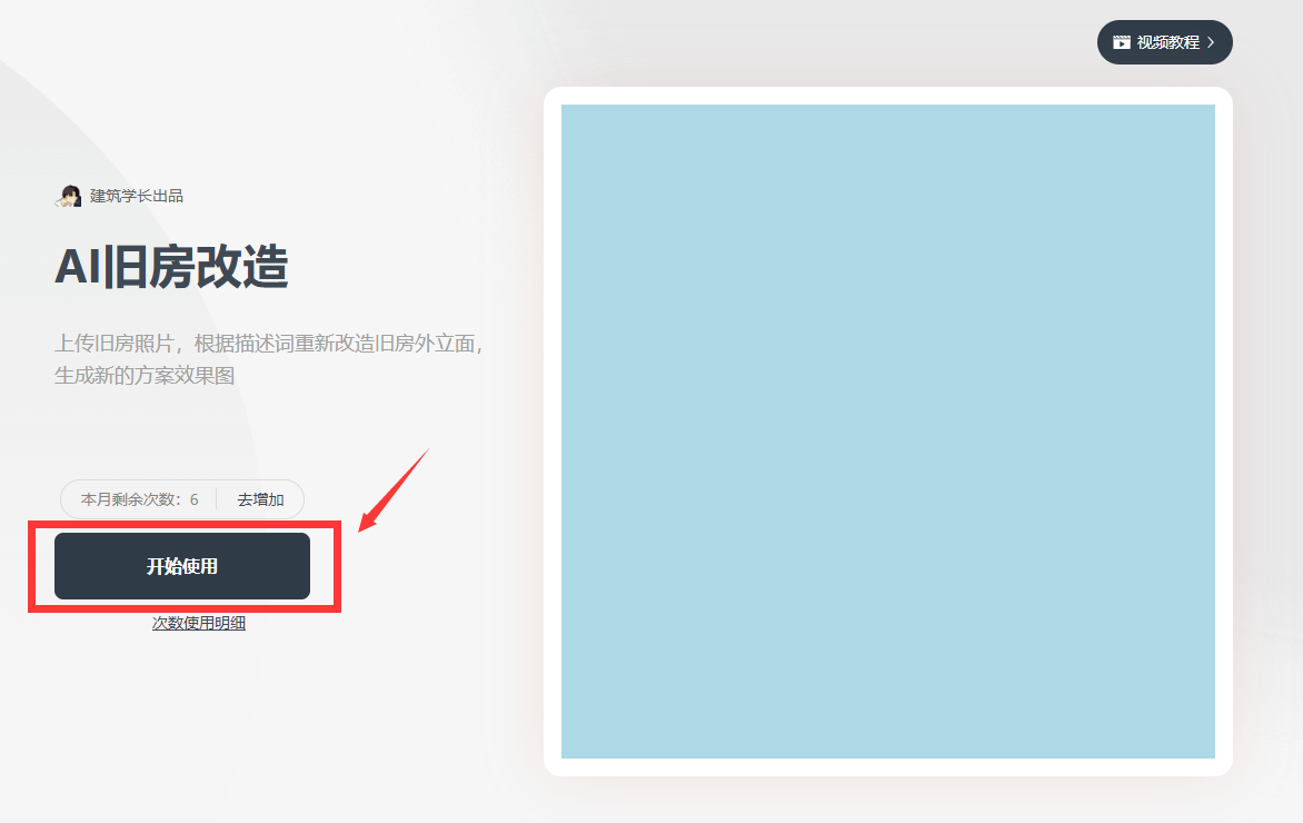 点击AI旧房改造,点击开始使用,点击本地上传,上传你给老旧小区拍的“定妆照。