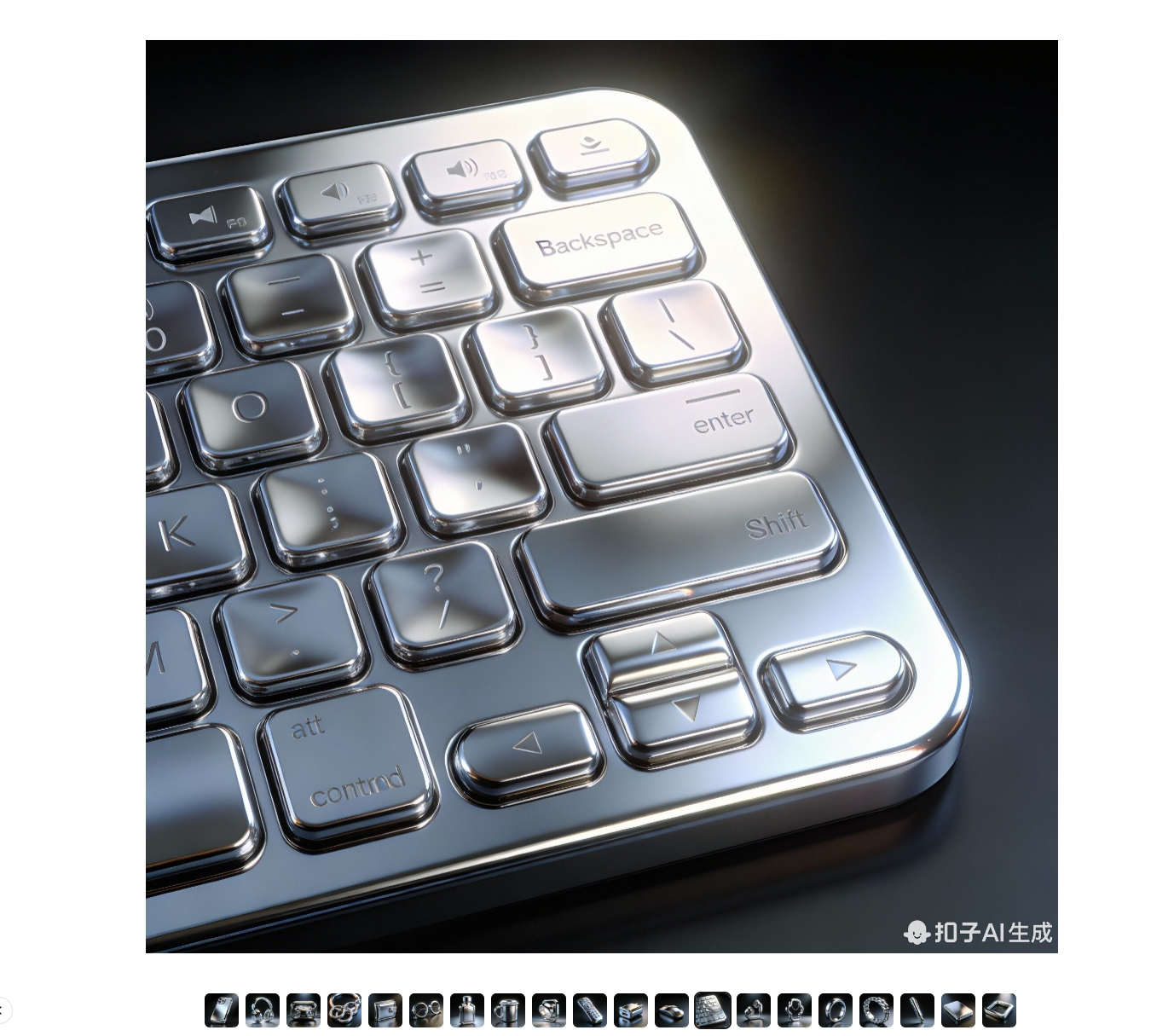 整个过程无需专业软件,只需浏览器访问AI平台。目标是生成20个不同物品的图标(如手机、耳机、手表、钥匙链等),所有图标保持相同风格:光滑的铬金属材质、高光反射、柔和阴影,背景为干净的深色渐变工作室光效,看起来高端未来感十足。分辨率高,适合电商使用。