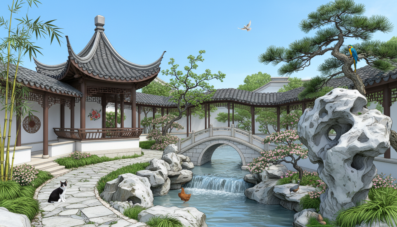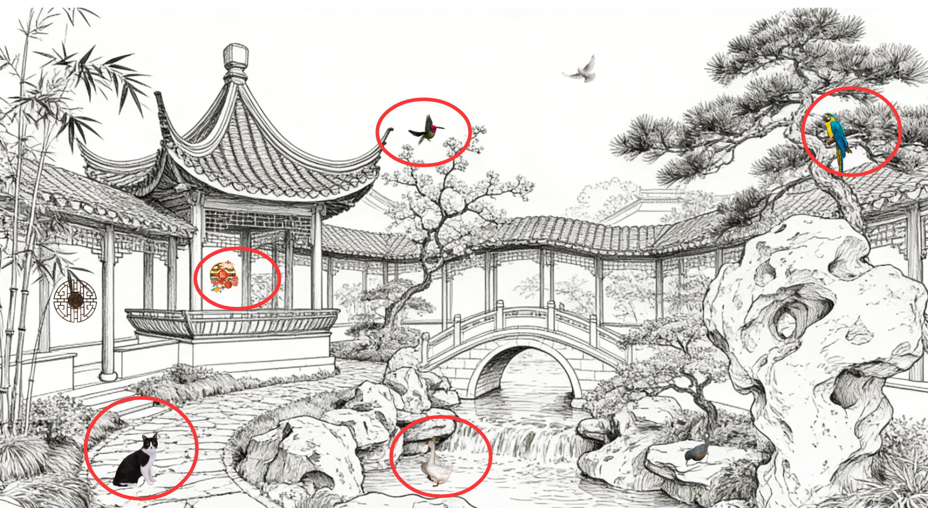 中式风格景观线稿图,还可以添加一下窗花、小鸟、猫咪、鸭子等符合场景的元素