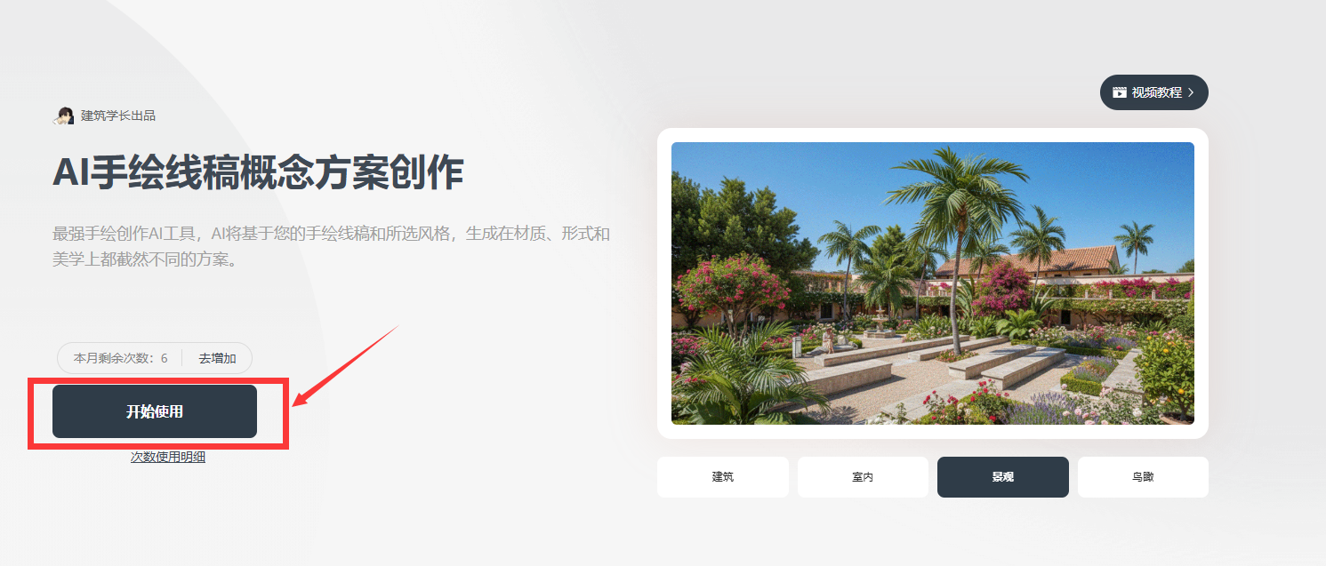 在AI工具页面找到——AI手绘线稿概念方案创作,点击“开始使用”,可以对四种手绘线稿进行创作(建筑、室内、景观、鸟瞰)