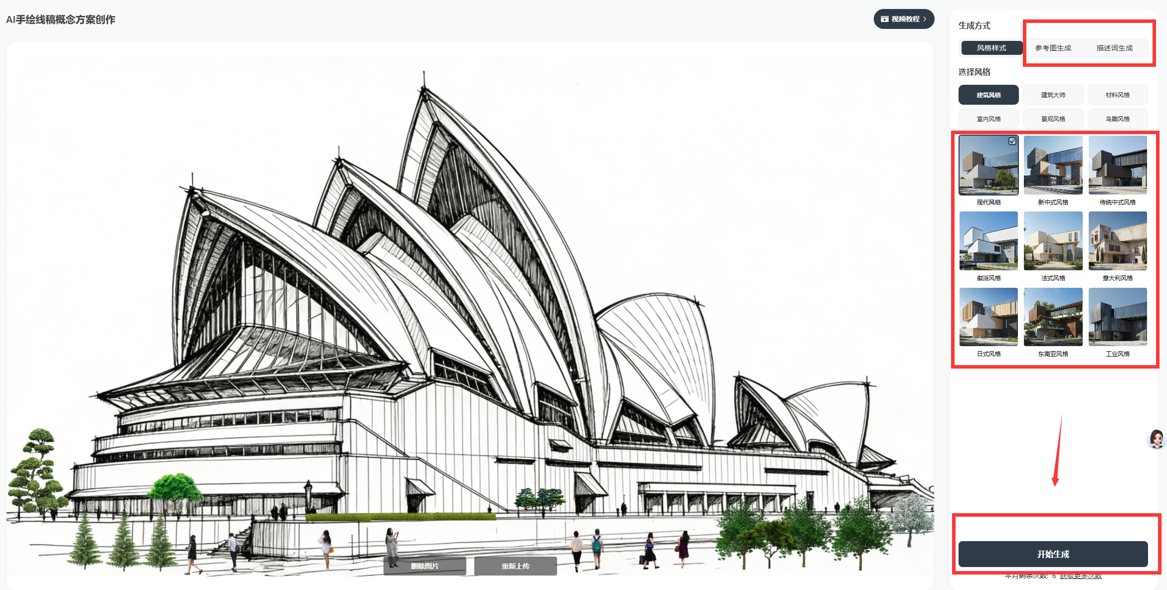 进入创作页面,右边选择你想要的建筑风格,提供九种现成风格选择,可选建筑大师和材料风格,这里我选择了“东南亚风格”,建筑大师选择“包豪斯”,材料风格选择了“混凝土风格”,除此之外,你可以上传想要的建筑风格图,或者通过描述词生成,选择完成后,点击“开始生成”。