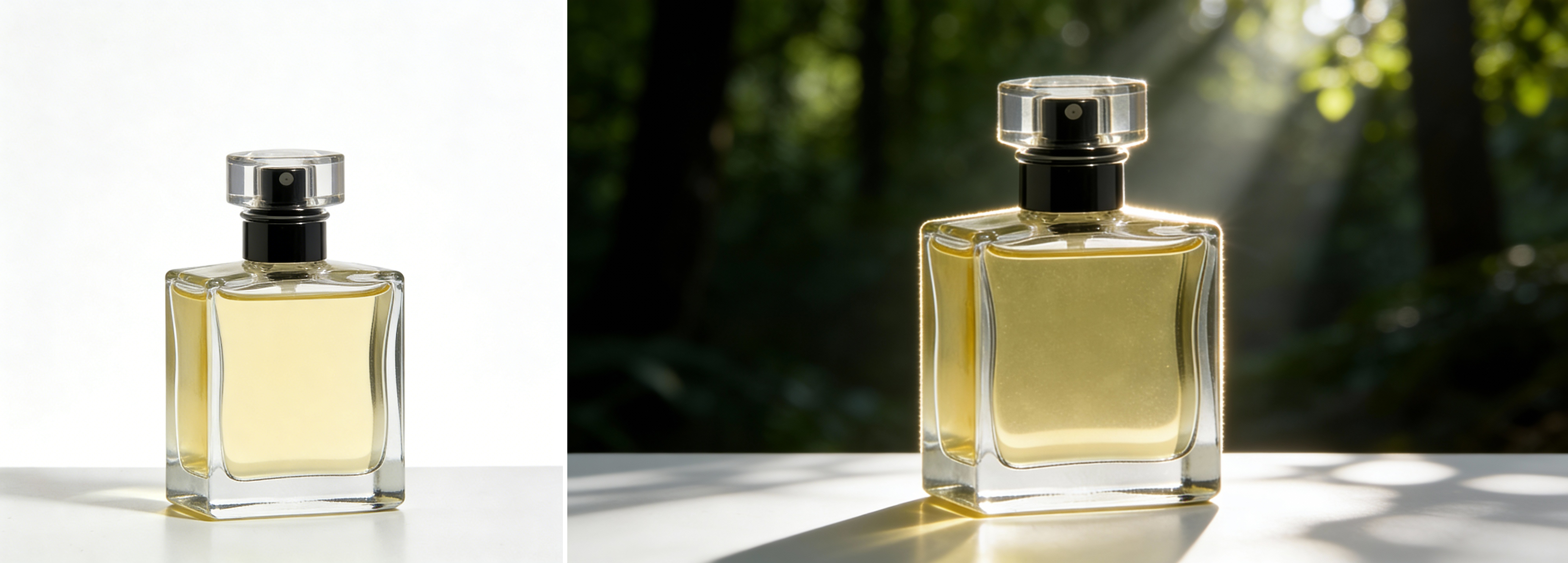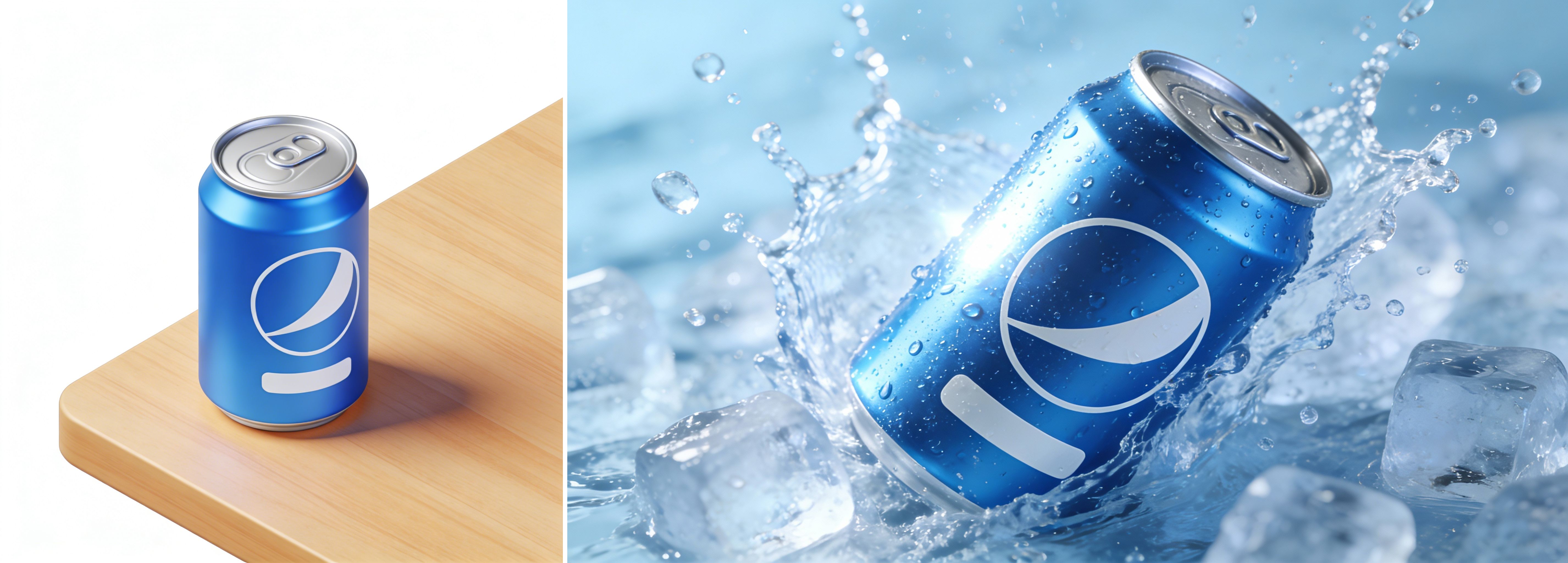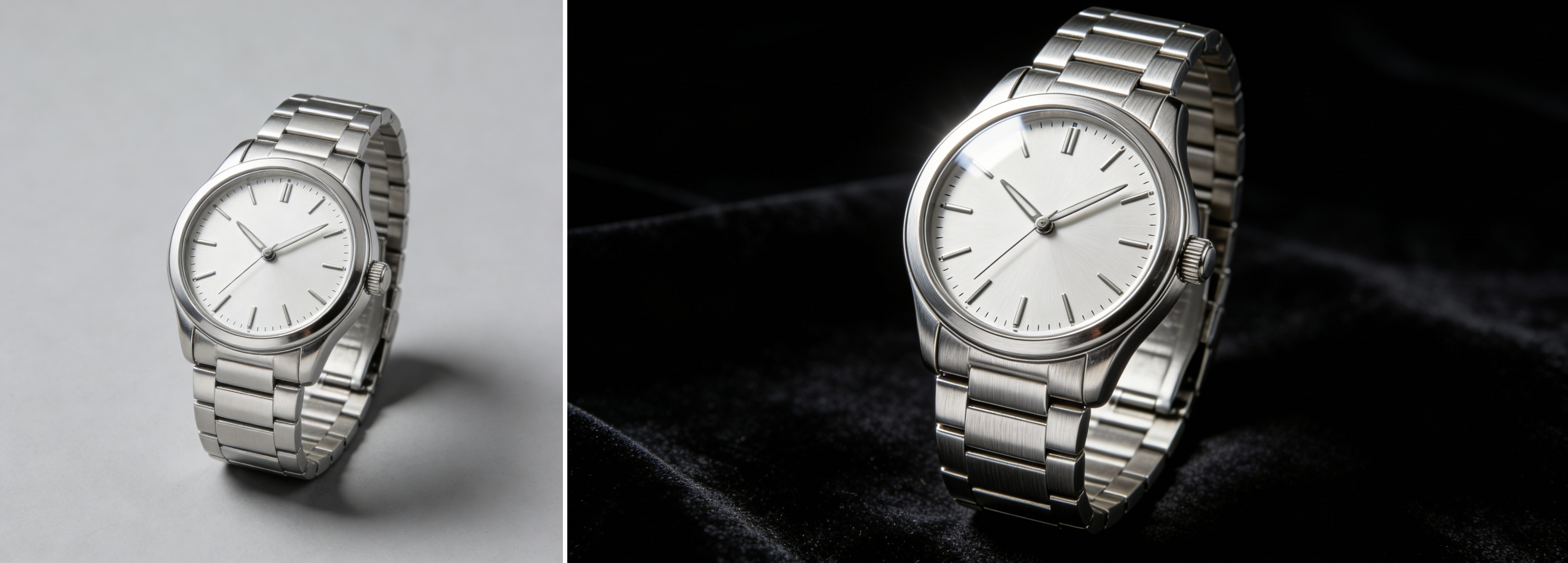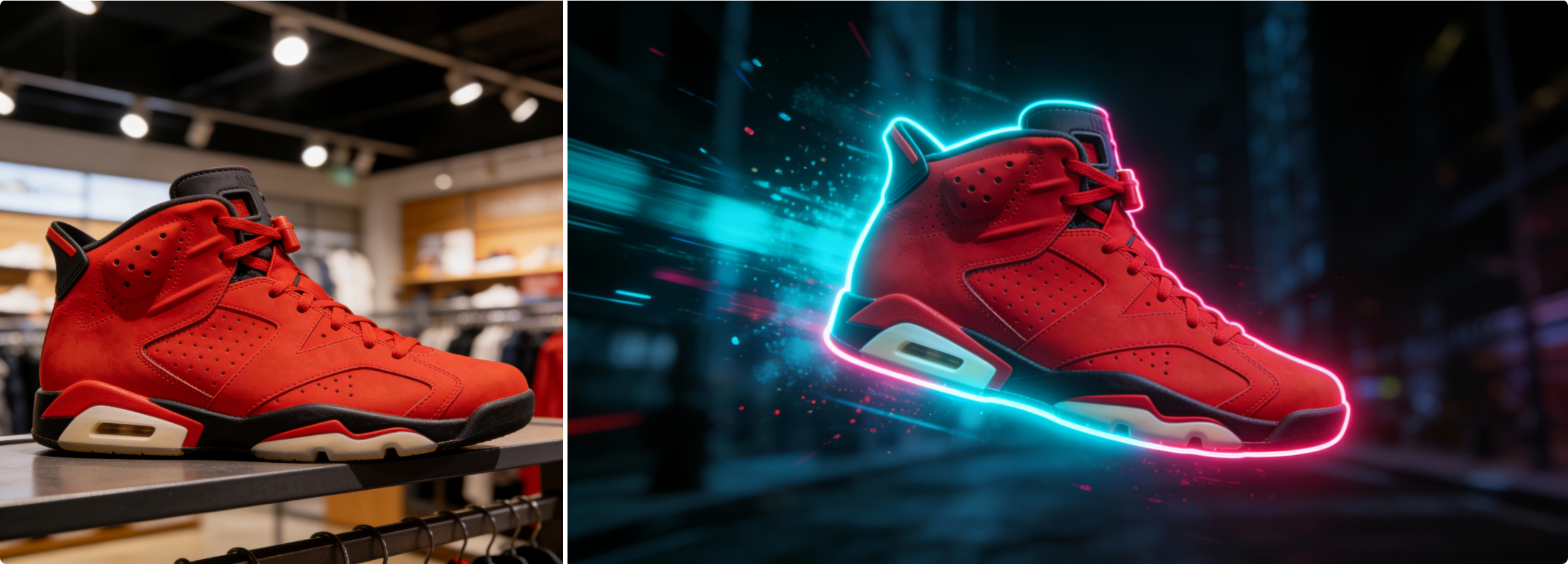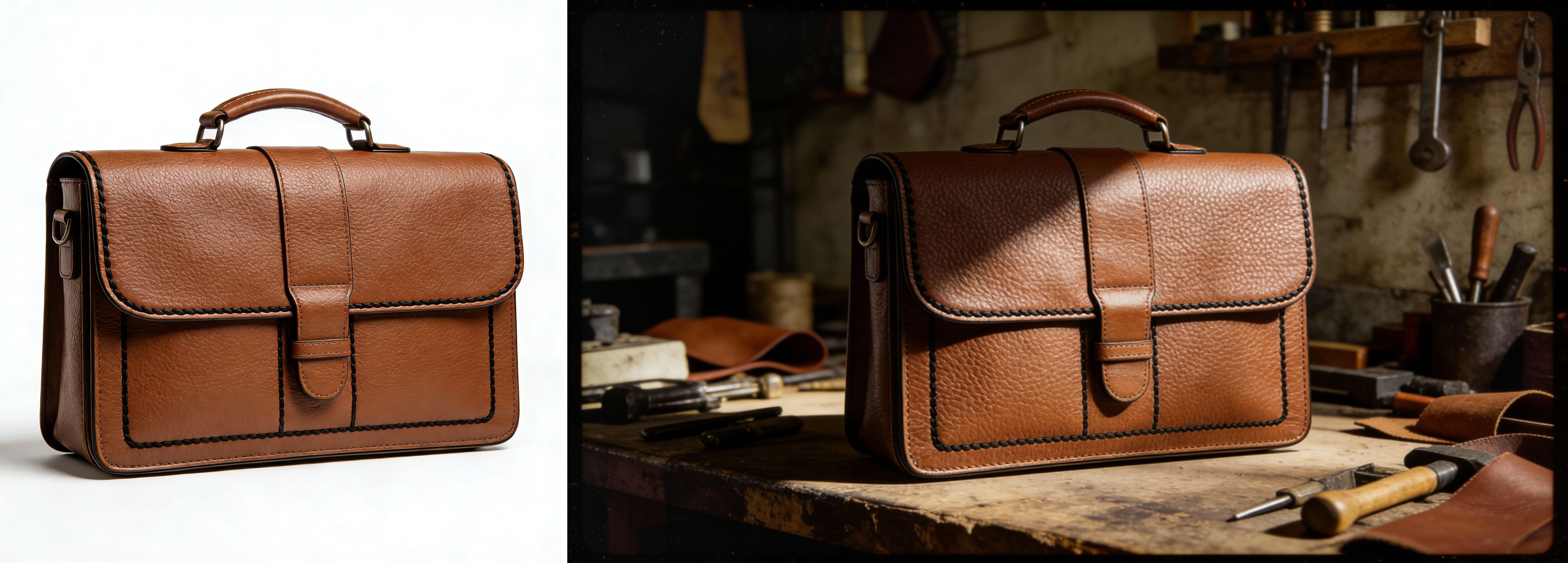 以前我们要把这样的产品修出高级感,得苦哈哈地找素材合成、手动画高光、压暗角,还得担心透视对不对。