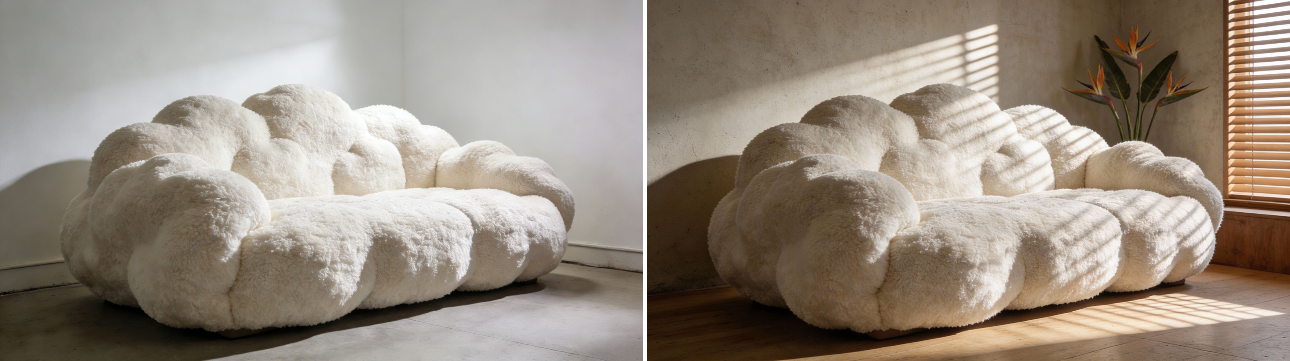 而现在,AI能直接根据你的描述,凭空构建一个高大上的场景,并在此基础上,自动为你的产品设置恰当的光影。