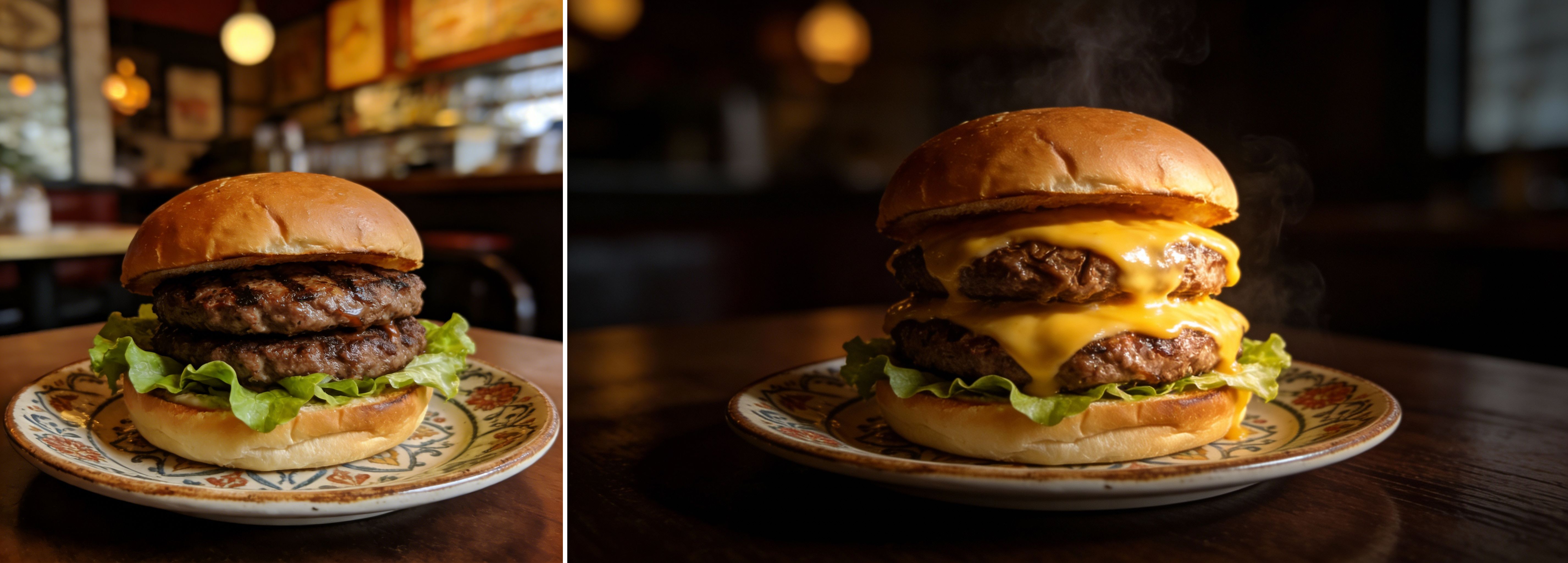 (主体) 双层芝士牛肉汉堡; (光影) 暖色调顶光,照亮融化的芝士和肉饼纹理,高光油润,轻微的烟雾缭绕效果,暗角聚焦主体;(背景) 深色木纹餐桌,背景有模糊的餐厅氛围灯;(规格)米其林美食杂志摄影。