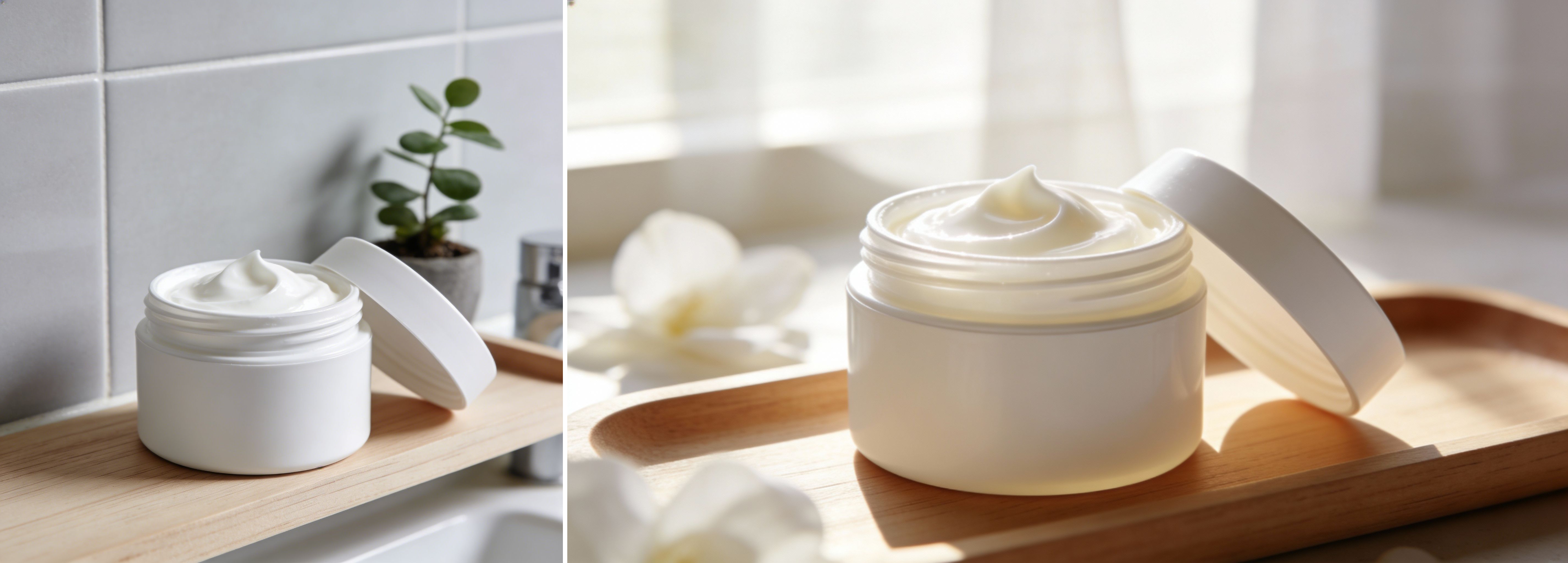 (主体) 打开的白色面霜罐,奶油质地膏体;(光影)温暖的晨间阳光,透过窗纱的柔和漫射光,膏体呈现细腻的半透明次表面散射; (背景) 模糊的白色花瓣和木质托盘,自然通透; (规格) 治愈系生活摄影。