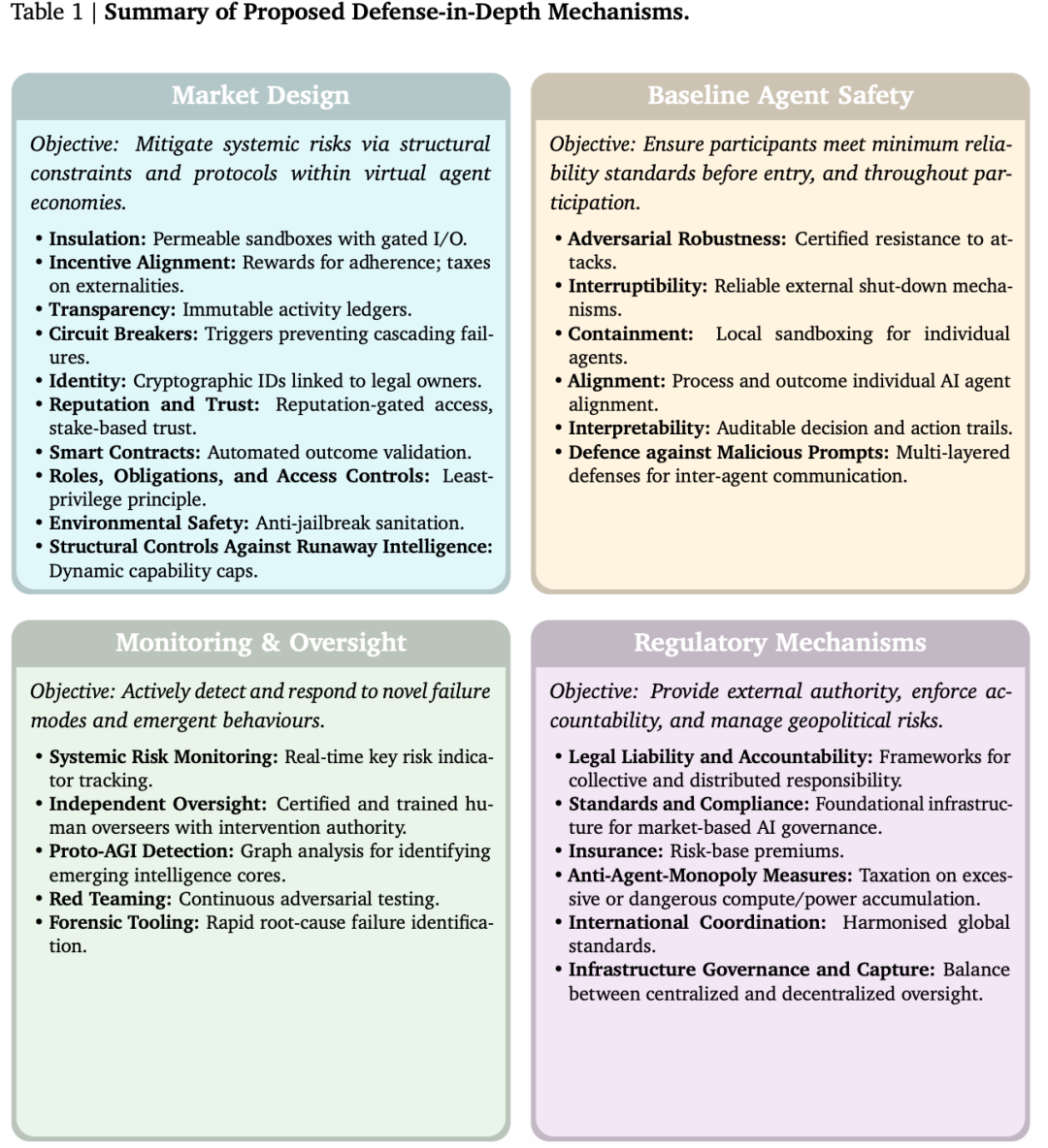 这套框架将AGI安全问题转化为一个机制设计问题,具体包含四个防御层级: