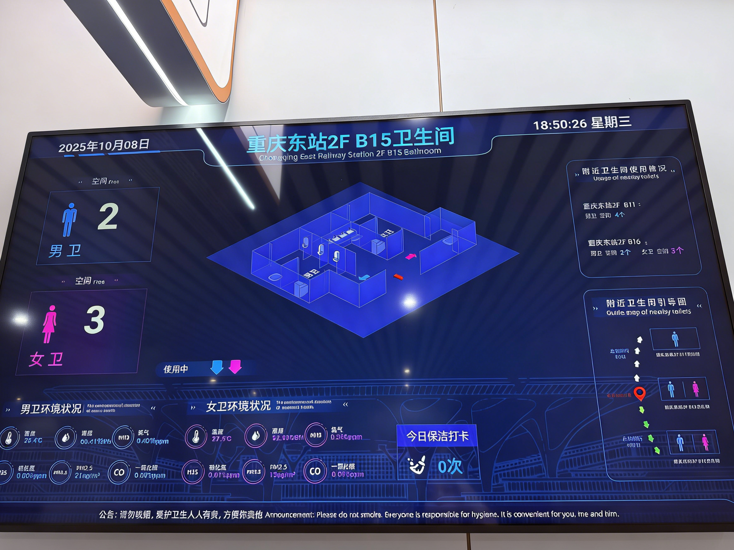 去过重庆东站的朋友都知道,作为全国最大的高铁站,重庆东站的卫生间绝对算得上是顶流中的顶流,因为有了AI的加入,直接让卫生间从“被动待命”升级成“主动服务的贴心管家”,搭起了一套全流程智慧运营体系,重庆东站的AI智慧卫生间也实力“圈粉”无数旅客。