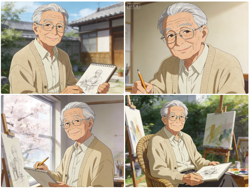 大师级作品,最佳质量,动漫风格,日本老爷爷,70多岁,智慧慈祥的表情,一头整齐的银白色头发,戴细框金属眼镜,穿着米色开衫和浅色衬衫,和蔼的微笑,手里拿着素描本或铅笔。,比例 「4:3」
