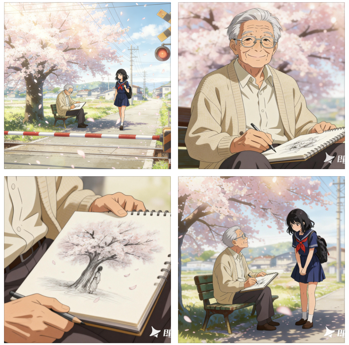 大师级作品,最佳质量,动漫电影风格,广角镜头,日本乡村樱花铁道口,红白栏杆抬起,漫天樱花飞舞(参考上传的参考图2)。一位银发的日本老爷爷(参考图1的人物形象,穿着米色开衫,戴眼镜)正坐在参考图2的旧的长椅上,对着樱花树写生。 一个穿着水手服的少女(参考图3的人物形象)正走过,注意到他时放慢了脚步。春天午后,温暖阳光,梦幻氛围。