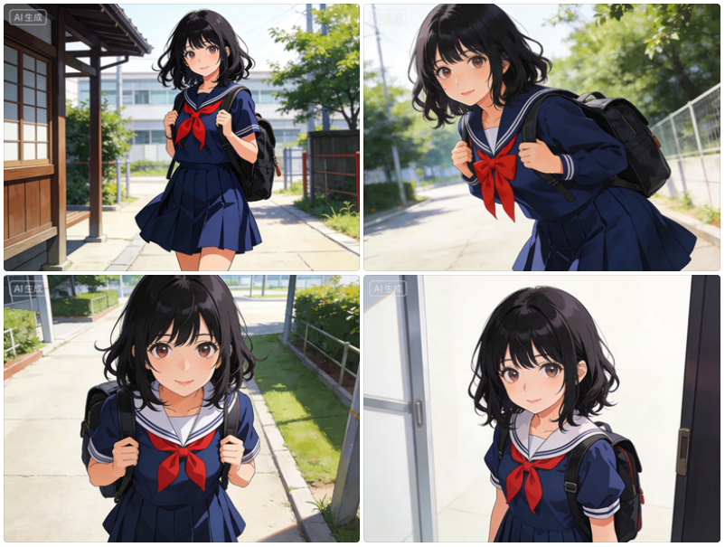 大师级作品,最佳质量,动漫风格,1个女孩,东亚少女,面容温柔,黑色齐肩短发略带波浪,大眼睛,穿着标准日本水手服(深蓝色裙装,红色领结),背着书包。,比例 「4:3」
