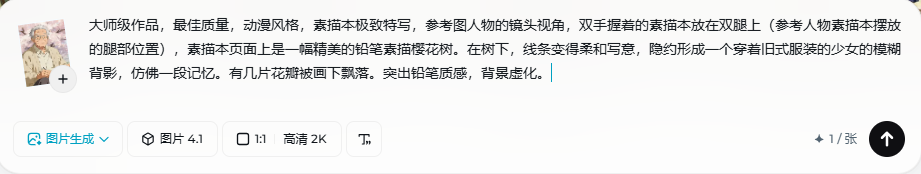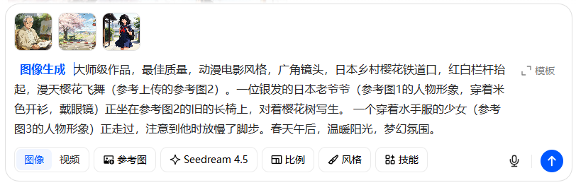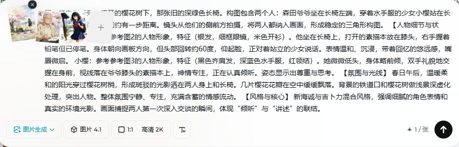 把分镜1和老爷爷、小樱的人物图作为参考图上传上去,提示词如下: