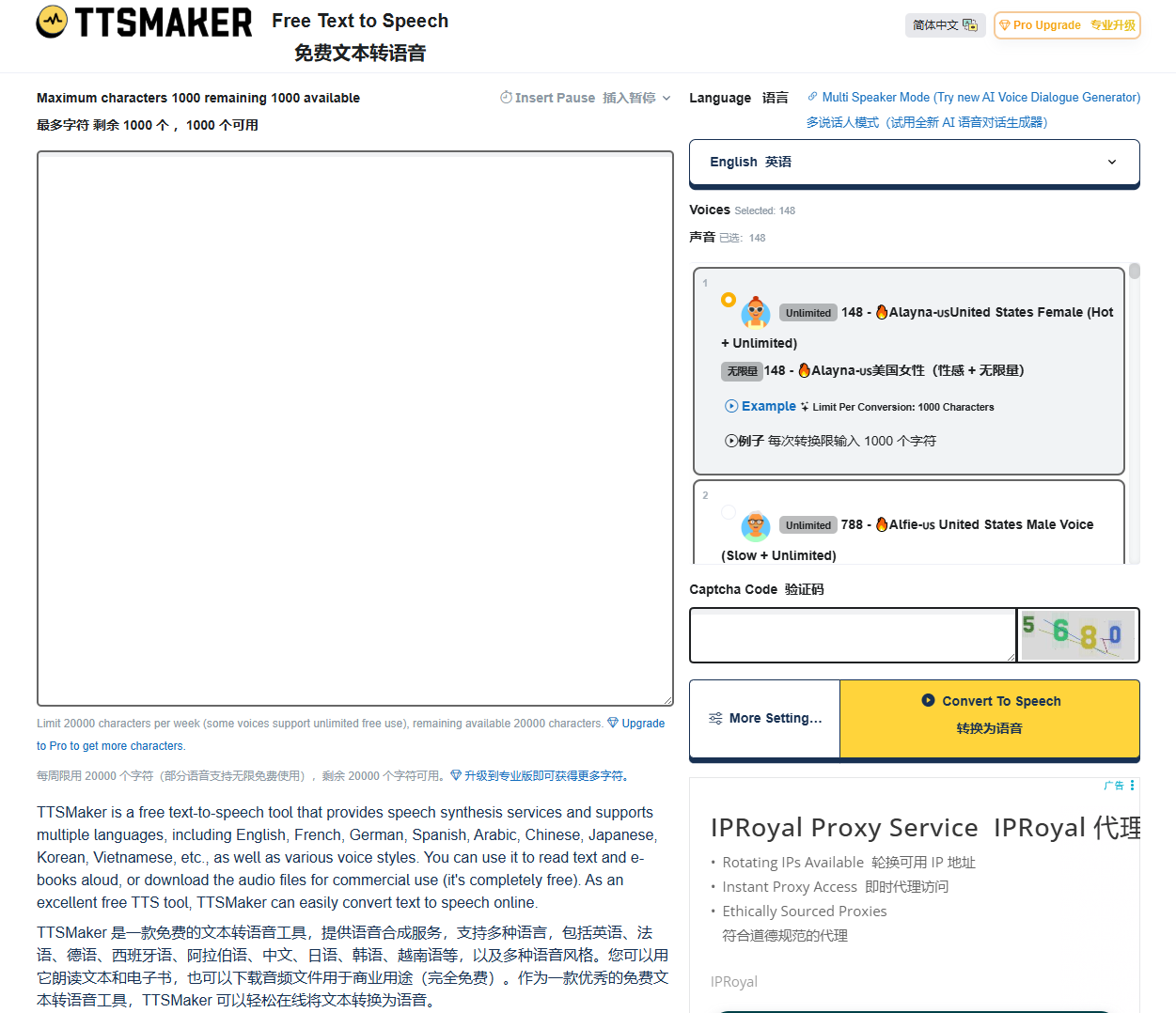这里我推荐一个网站,ttsmaker AI:https://ttsmaker.com/;它是一款免费的文本转语音工具,并且支持多种语言,包括英语、法语、德语、西班牙语、阿拉伯语、中文、日语、韩语、越南语等,唯一不足的就是语音风格有点偏少。