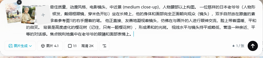分镜2的静态图生成流程和分镜1一样,将生成的分镜1的静态图和老爷爷的人物图作为参考图上传给即梦(因为后面豆包生成的图有问题,没达到我想要的,就换成即梦了) ,让它按照你的要求给你生成。提示词如下:
