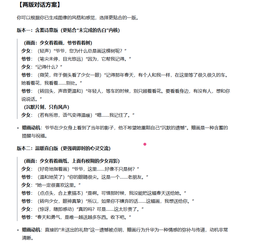 4 | 固定机位侧近景镜头,捕捉对话瞬间的微动态。少女轻声对爷爷说:“爷爷,您为什么总是画这棵树呢?(对口型)”爷爷(笔尖未停,目光悠远)“因为,它帮我记得。(对口型)”,少女回道:“记得什么?(对口型)”爷爷:(微笑,终于侧头看了少女一眼)“记得那年春天,有个人和我一样,在这里等了很久很久的车。她看着花,我看着……别处。(对口型)”少女倾听时,眼睫有轻微的垂下与抬起,表达思考。一阵微风拂过,带动她额前的发丝和爷爷画纸的一角轻轻颤动。更多的樱花花瓣从树上旋转飘落,穿过两人之间的空间。光线保持稳定,营造一个时间仿佛为这个对话片刻而放慢的宁静气泡。 |