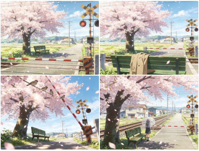 我们先来设定少女小樱和爷爷森田的人物图,以及铁道口的场景图,后期在生成各镜头静态图时,就能保证人物和场景的一致性了。这一步是为了约束 AI 在给到特定场景时不跳脱。
