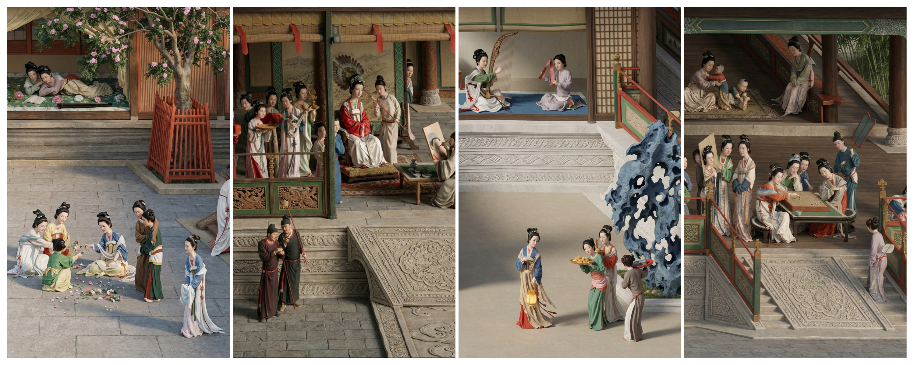 采用固定镜头右向匀速平移运镜,全景呈现庭院雅乐侍宴场景,平移过程中,抚琴仕女拨弄琴弦的指尖、舞袖者轻扬的罗带褶皱、侍女端持的茶点托盘、太湖石的镂空纹理等细节依次自然舒展,画面丝滑过渡,营造幽婉雅致的庭院宴乐视觉体验。