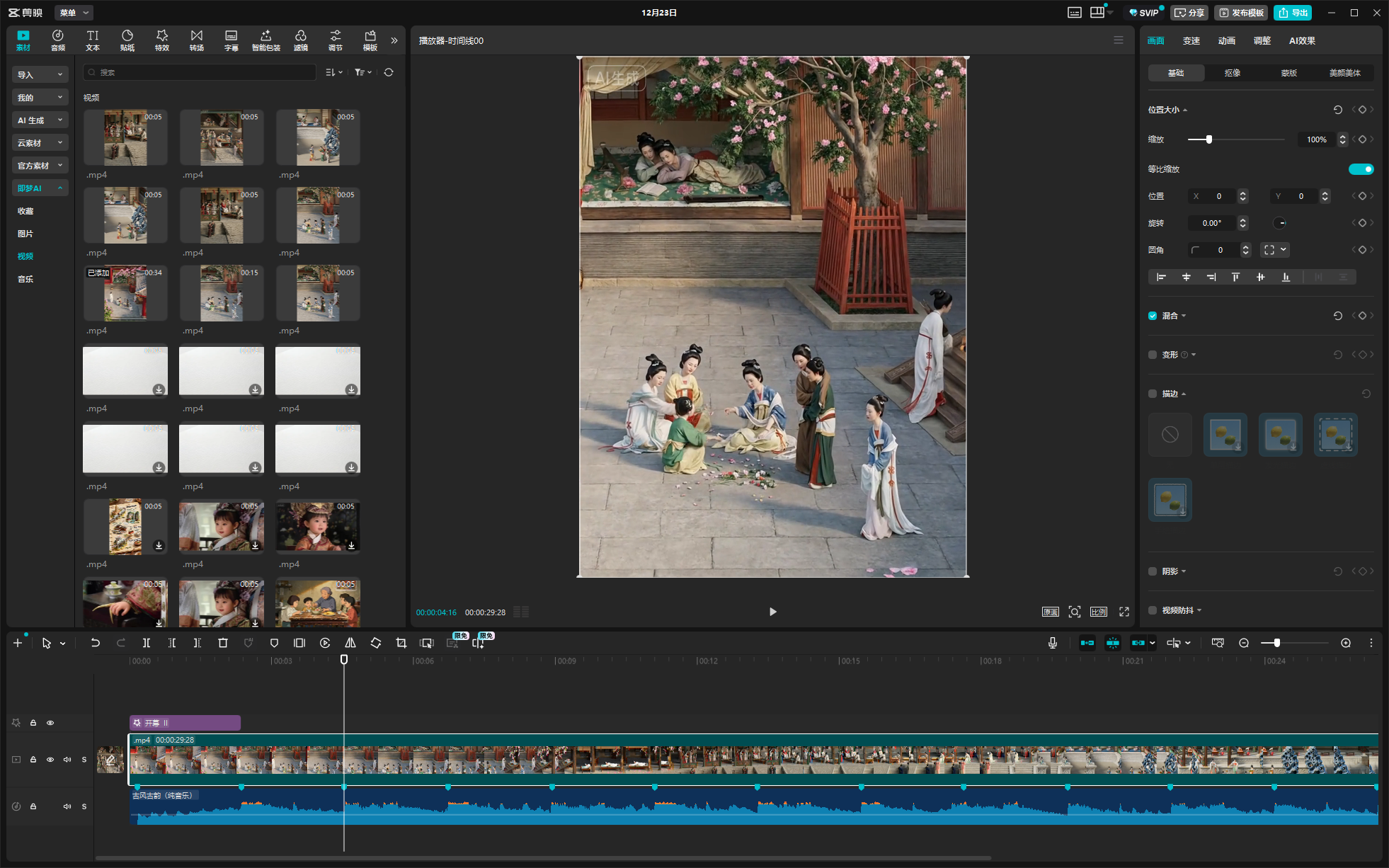 打开剪映,导入AI生成的视频片段,添加BGM:选轻快的纯音乐(比如古风背景音乐)就可以啦~