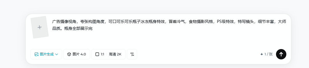 提示词优化为:广告摄像视角,夸张构图角度,可口可乐瓶子冰冻瓶身特效,冒着冷气,食物摄影风格,PS级特效,特写镜头,细节丰富,大师品质。