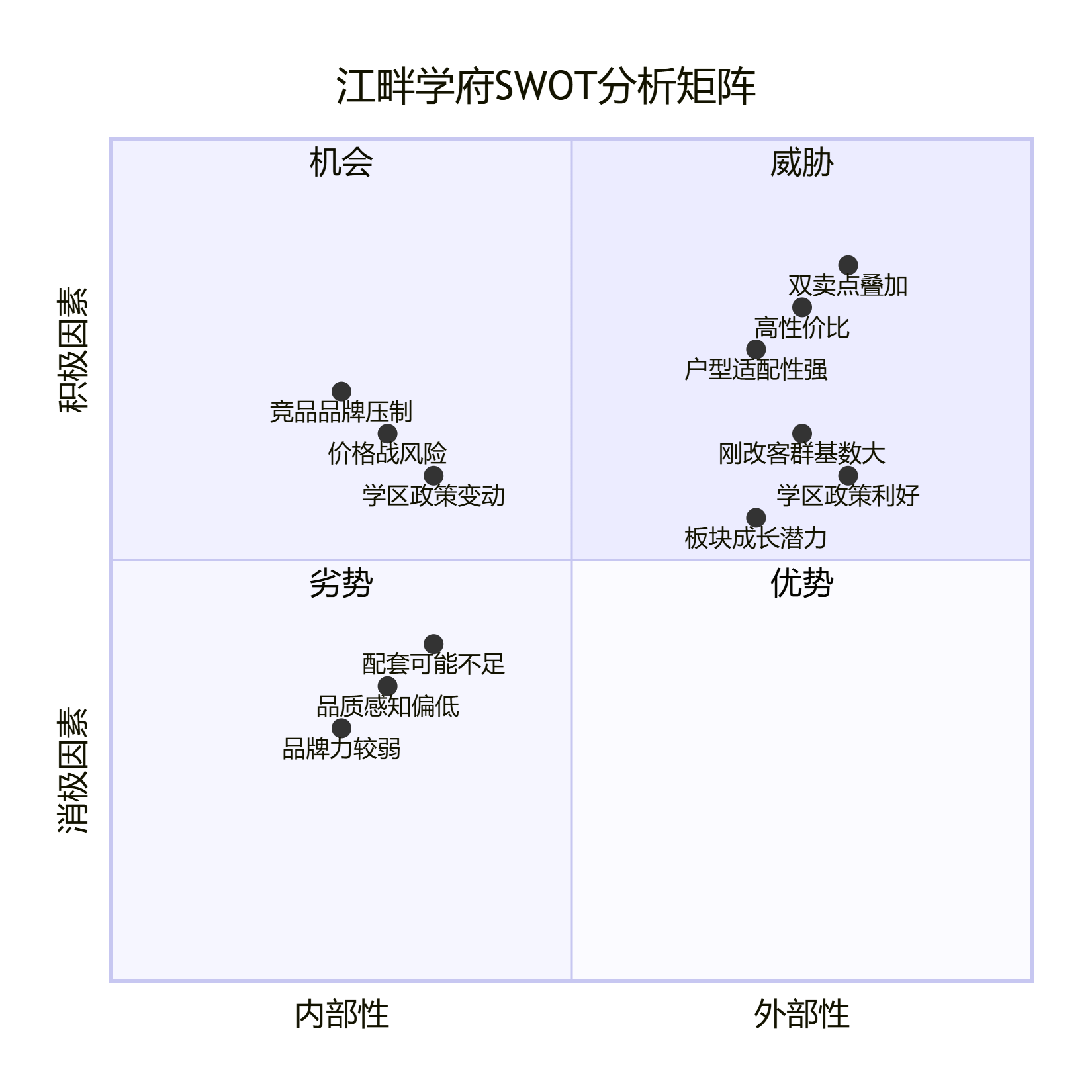 1. 市场刚需及刚改客群基数大:总价可控+学区+江景,形成差异化竞争力。 2. 学区政策利好:若学区确定性高,可吸引重视教育的家庭。 3. 板块成长潜力:沿江板块持续开发,区域价值看涨。 | 1. 竞品品牌压制:绿城、万科可能通过品牌优势分流客户。 2. 价格战风险:若竞品促销,可能挤压江畔学府性价比空间。 3. 学区政策变动:学区划分若有调整,将削弱核心卖点。 |