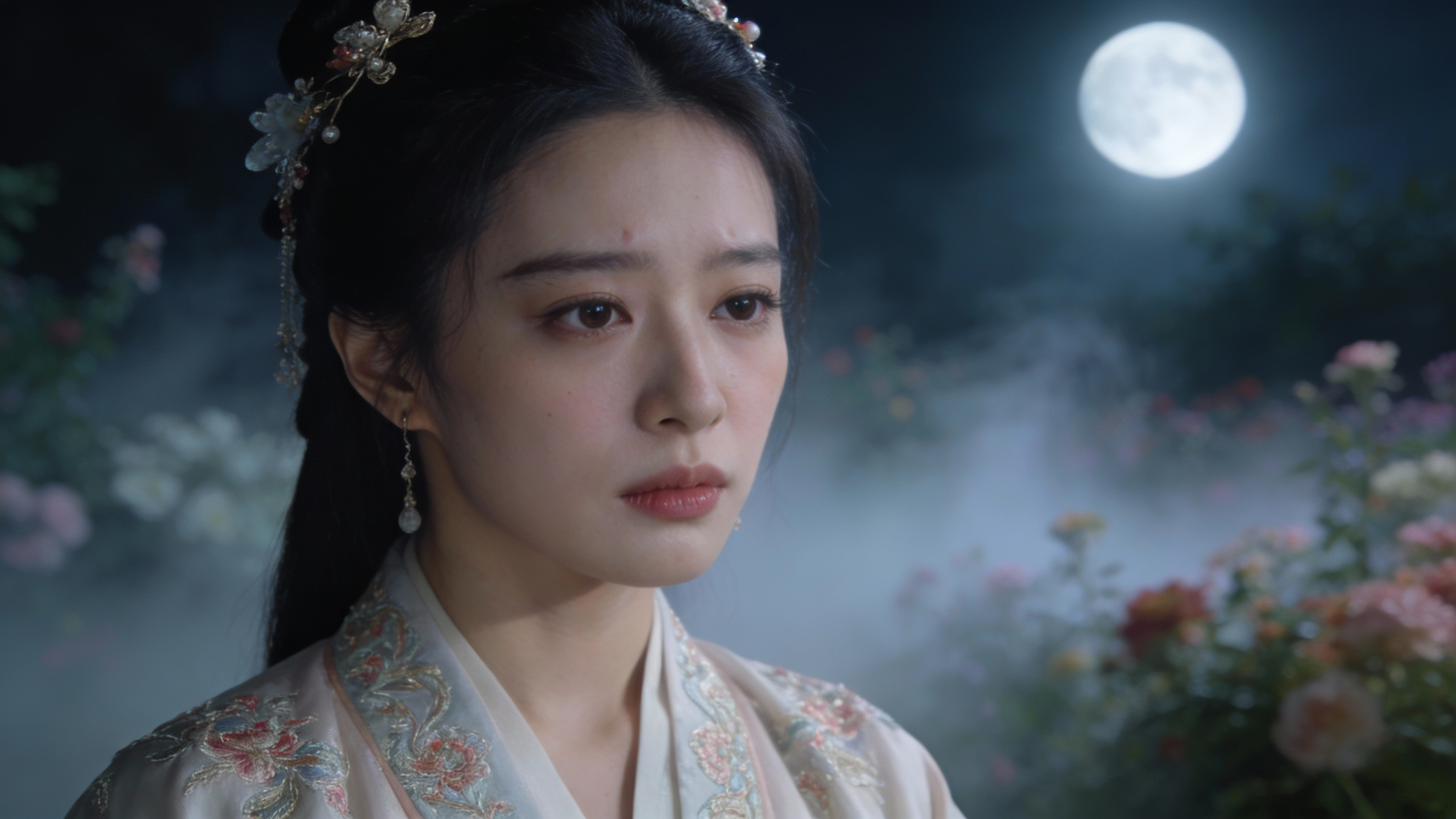 📋提示词:电影镜头,特写,绝美的中国古装女子,身穿传统汉服,精致刺绣,优雅发饰,忧伤的眼神,细腻皮肤纹理,雾气弥漫的花园背景,月光,浅景深,8k分辨率,照片级真实。