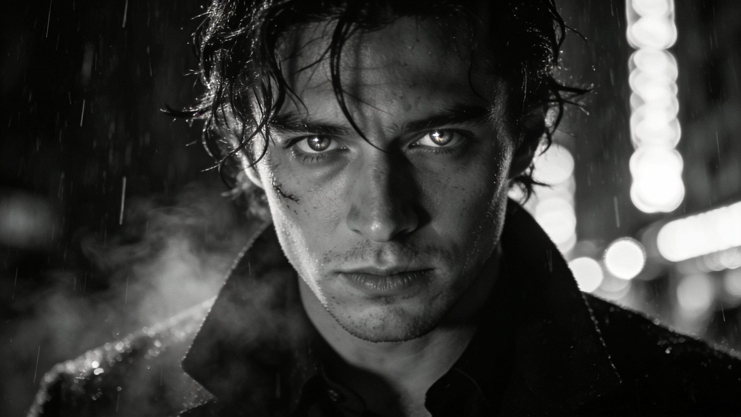 📋提示词:电影剧照,新黑色电影风格,英俊侦探的特写,雨水打湿了凌乱的头发,脸颊上有淡淡的伤痕,怀疑且犀利的凝视,眼中反射出城市的霓虹灯光,黑暗雨夜背景,戏剧性布光,体积雾,高对比度,8k,照片级真实。