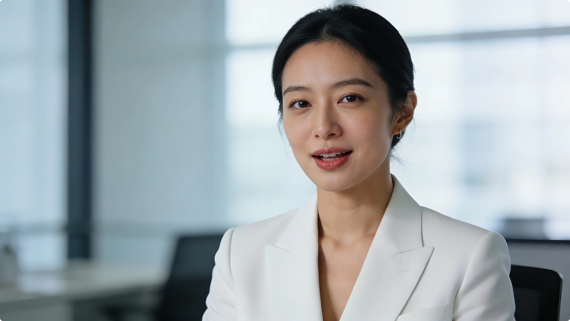 📋提示词:自信的亚洲女商人的职业肖像,30岁,身穿干练的白色西装,对着镜头说话,现代极简办公室背景,摄影棚灯光,轮廓光,自信的表情,高细节,4k。