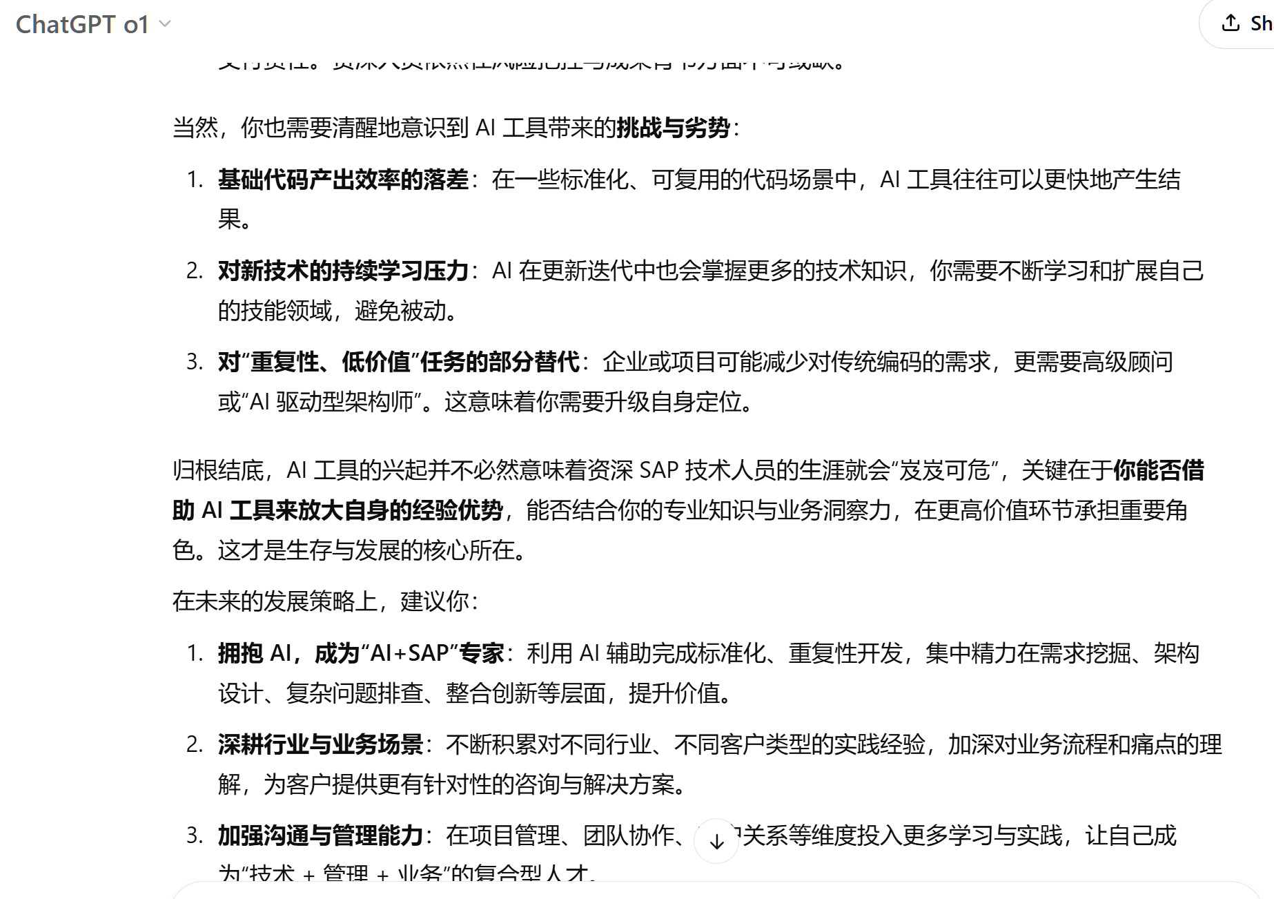 虽然 ChatGPT 和 DeepSeek 在速度、规模化和某些通用场景的代码生成效率上,确实可以碾压传统的人力开发方式,然而对于资深 SAP 顾问而言,在以下方面仍有不可替代性与优势: