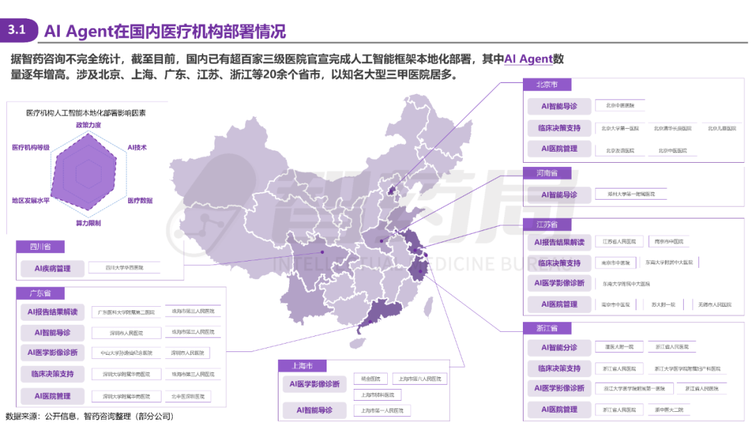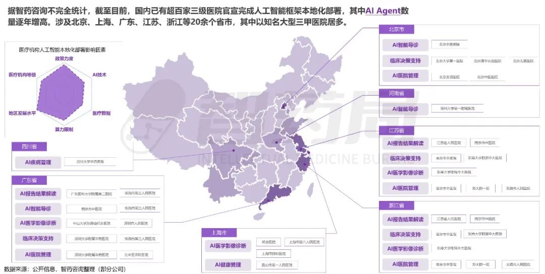 据不完全统计,包括复旦大学附属中山医院、四川大学华西医院等顶级三甲在内,北京、上海、广东、江苏、浙江等20余个省市的医疗机构已率先部署AI Agent,发挥示范引领效应,推动Agent+医疗从试点探索进入规模化推广的新阶段。