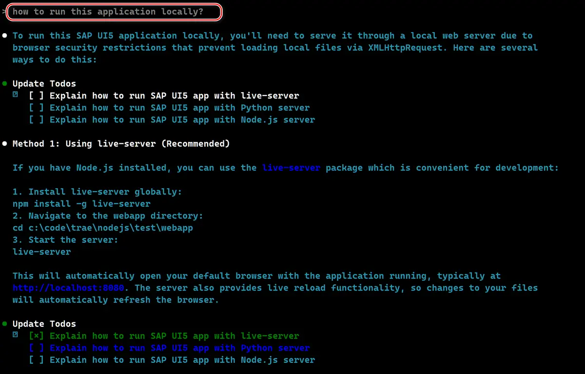 Claude Code 马上给出本地使用 live-server,Python server 和 Node.js server 三种方式运行这个 SAP UI5 应用的详细步骤。