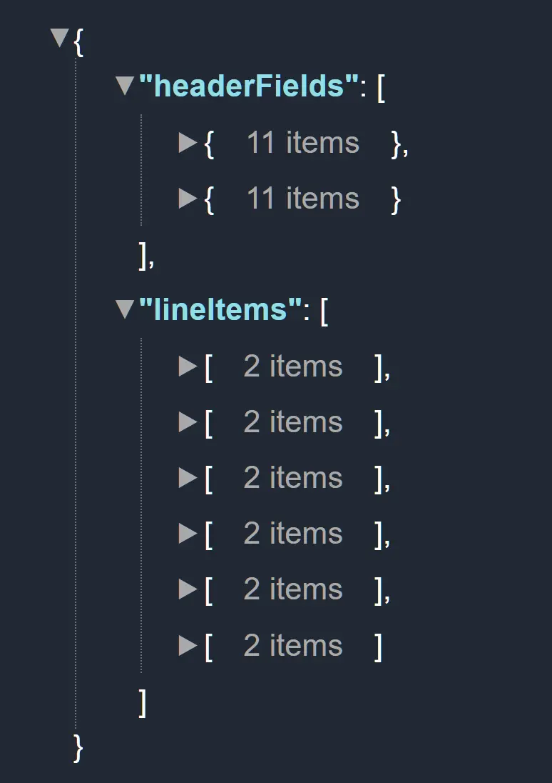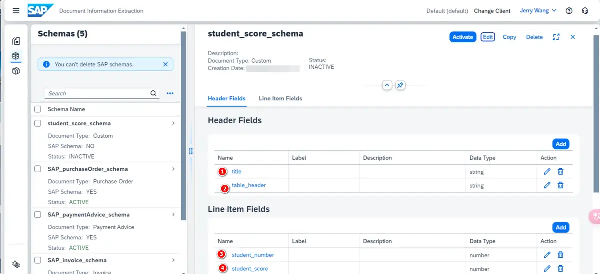 在这个 Schema 的明细编辑界面,我根据 PDF 的布局,依次创建了两个 Header Fields 和 两个 Line Item Fields.