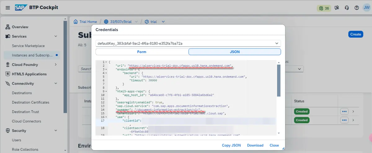我们在 SAP BTP Document Information Extraction Service Key 里,能找到 swagger 也就是服务 API 的调用控制台的 url.