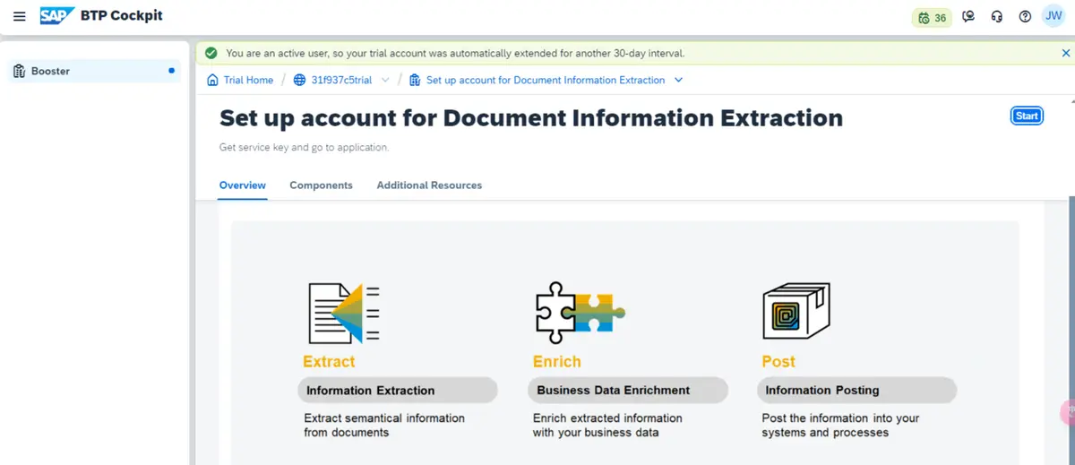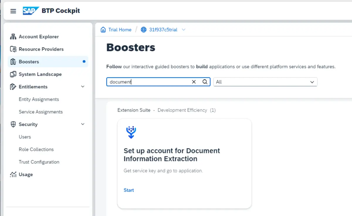 在 BTP Cockpit 的 Boosters 区域,根据关键字 document 搜索,找到 Document Information Extraction 的 Boosters 即配置加速器,点击 Start 按钮就可以一键配置。