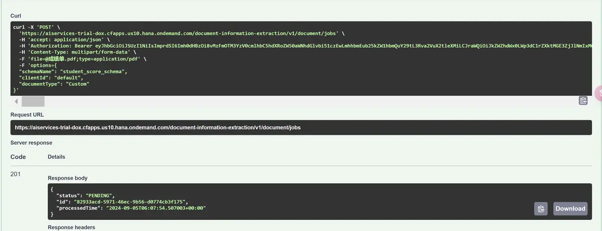 服务器端返回了这个作业的 id 和状态。文档信息提取是异步过程,状态为 Pending,说明提取尚未结束。