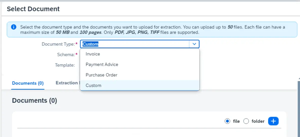 从 Select Document 弹出对话框 Document Type 的下拉选项里,我们可以看出,Document Information Service 预制的文档信息提取场景,支持 Invoice,Paument Advice 和 Purchase Order 这些订单类型。