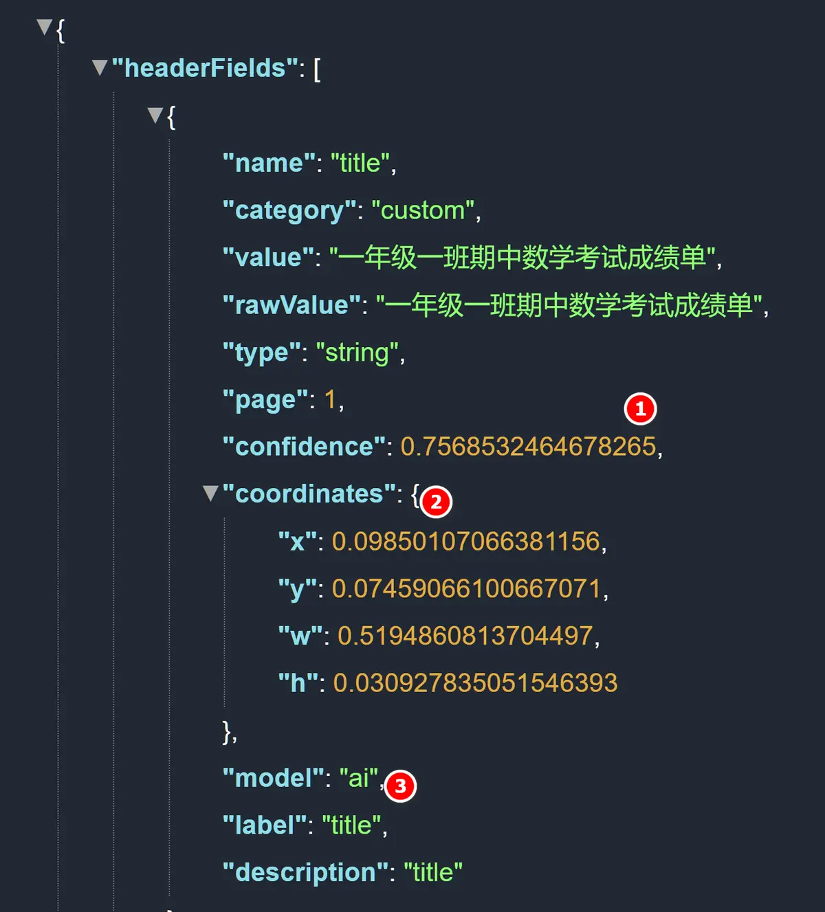 在提取结果里,从上到下依次显示了 Custom Schema 里定义的字段名称,和实际从文档中提取到的字段值。