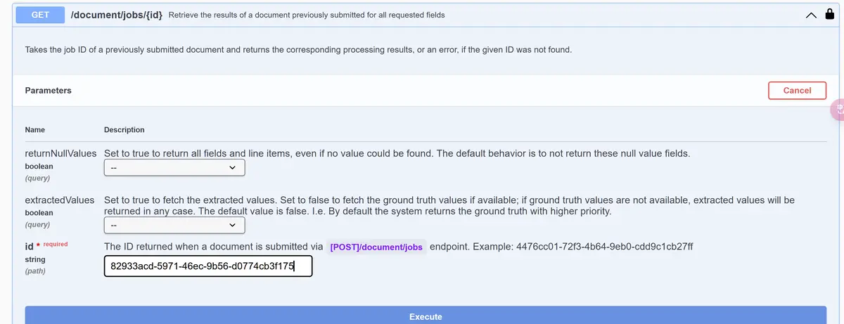 使用 API /document/jobs 来提交一个新的文档信息提取作业。点击 Try it out 按钮: