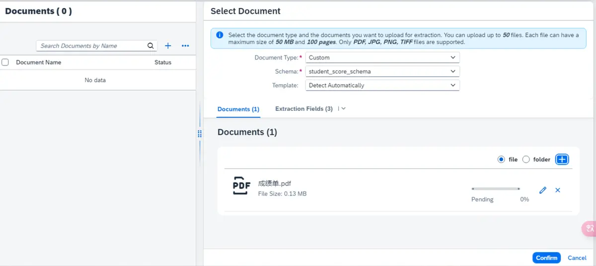 创建一个新的 Document Extraction 任务,选择刚刚创建好的 Schema,再上传本地的成绩单 PDF 文件,点击 Confirm: