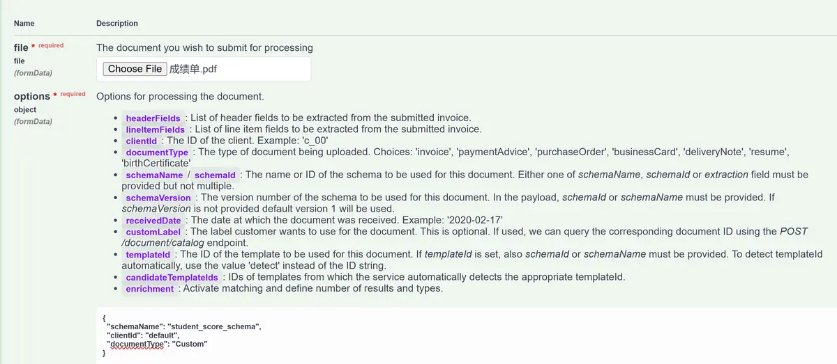 在请求 Payload 区域,给 file 字段指定成本地 PDF 文件,其实就是指定我们之前创建的 Custom Schema.