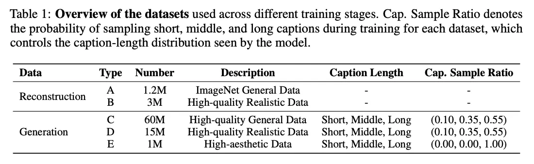 SVG-T2I DiT 训练细节。 本文采用 Lumina-Image-2.0 (Qin 等人,2025) 中的 Unified Next-DiT 架构作为扩散 transformer 的骨干网络。对于文本条件,本文利用 Gemma2-2B 大型语言模型来提取丰富的文本嵌入,该模型具有强大的多语言能力。本文将最大文本标记长度设置为 256,以平衡前三个阶段的长字幕建模能力和训练效率。在高质量数据调整状态下,最大文本标记长度设置为 512。数据 C、D、E 中的每张图像都标注了三种长度(短、中、长)的双语字幕(中文和英文)。在训练过程中,本文采用混合采样策略,选择字幕语言和长度。短、中、长字幕的采样概率如下表1所示,语言采样比例固定为中文 0.2,英文 0.8。