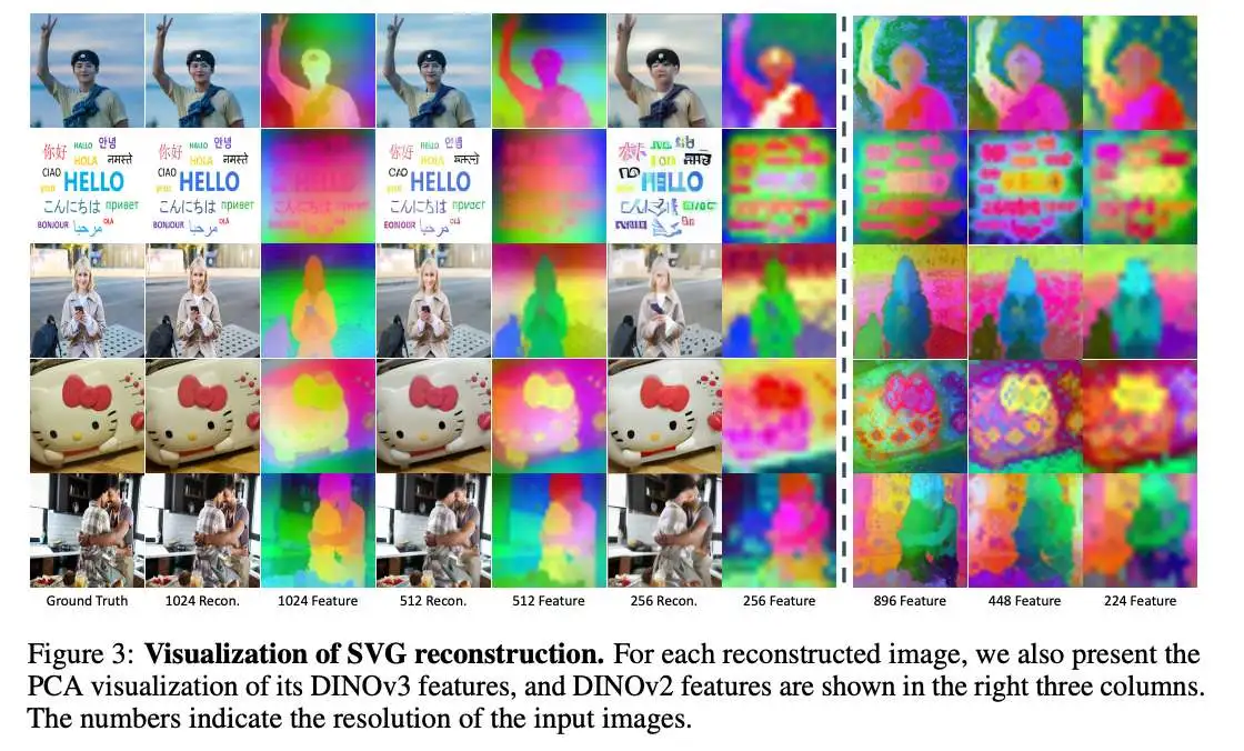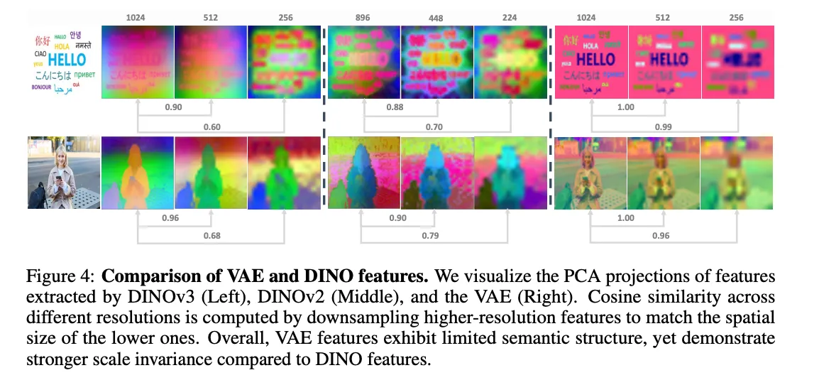当前 VFM 特征的局限性。 现有自监督学习方法生成的表示捕获了高级语义上下文和细粒度视觉细节,为下游重建和生成提供了强大的基础。原则上,这些表示在很大程度上是自给自足的。然而,当训练范式涉及多种输入分辨率时,这种自给自足性受到严峻挑战。如下图4所示,VAE 特征表现出几乎与分辨率无关的行为。它们的跨分辨率余弦相似度接近 1.0,而 DINOv3 和 DINOv2 特征则变化更大。这一观察结果表明,VFM 派生特征在不同尺度上经历了不可忽略的偏移。