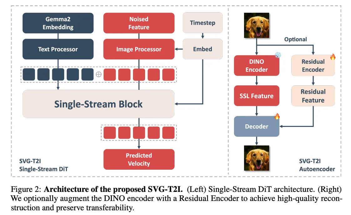 SVG证明了在高维 VFM 特征空间中实现高质量图像重建和类别到图像生成的可能性。在此基础上,SVG-T2I 将该方法扩展到大规模文本到图像训练,从而能够直接在 VFM 特征域中进行有效生成。SVG-T2I 的整体架构如下图2所示。