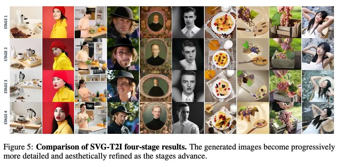 SVG-T2I 成功地将原始 SVG 框架扩展到大规模、高分辨率的文本到图像合成,从而产生了 SVG-T2I 模型。