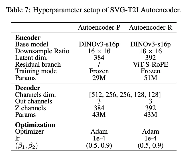 SVG-T2I 自动编码器。 继承自 SVG和 RAE的架构设计,本工作发布了两种自动编码器配置,以促进社区研究。第一种是 autoencoder-P (Pure),它直接利用冻结的 DINOv3 特征。第二种是 autoencoder-R (Residual),它保留了 SVG 中的残差分支设计作为可选方案。当需要更高的保真度时,此残差模块(基于 Vision Transformer)旨在补偿高频细节和偏色伪影。两种变体都使用相同的解码器设计,将特征映射回像素空间。
