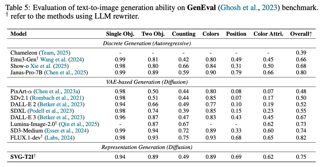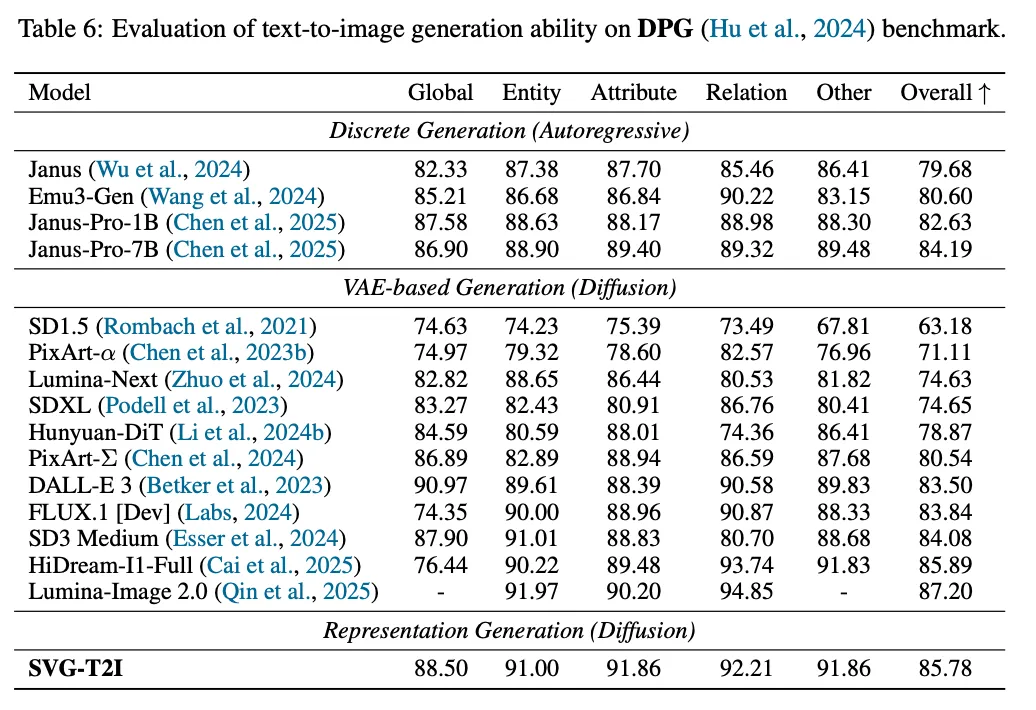 评估。 本文通过定量和定性指标评估了 SVG-T2I。本文报告了 GenEval和 DPG-Bench的性能,以根据其官方协议评估 SVG-T2I 的全方位能力。所有用于评估的图像均以 1024 × 1024 的高分辨率生成。本文的 SVG-T2I 模型成功地扩展了 VFM 表示范式,实现了大规模 T2I 生成,并在这两个基准上取得了有竞争力的性能。在 GenEval(如下表5所示)上,本文的最终模型 SVG-T2I 总体得分为 0.74,与 SD3-Medium等模型的性能相匹配,并显著超越了 SDXL和 DALL-E 2。此外,在 DPG-Bench(如下表6所示)上,SVG-T2I 总体得分为 85.78,在统计上与 FLUX.1和 HiDream-I1-Full等顶级基于 VAE 的扩散模型相当。