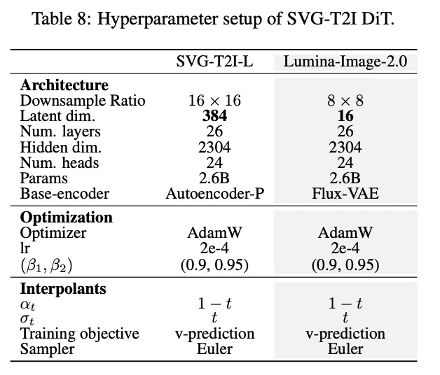 SVG-T2I 自动编码器训练细节。 自动编码器采用渐进式策略进行训练。首先,模型在 ImageNet (数据 A) 上以 256×256 的固定分辨率预训练 40 个 epoch。然后,在多分辨率微调阶段,本文使用来自 3M 样本数据集 (数据 B) 的原始分辨率图像继续训练。在此阶段,模型以 512×512 的锚定分辨率训练 10M 图像,然后以 1024×1024 训练额外的 6M 图像。训练的超参数设置可参考下表7。