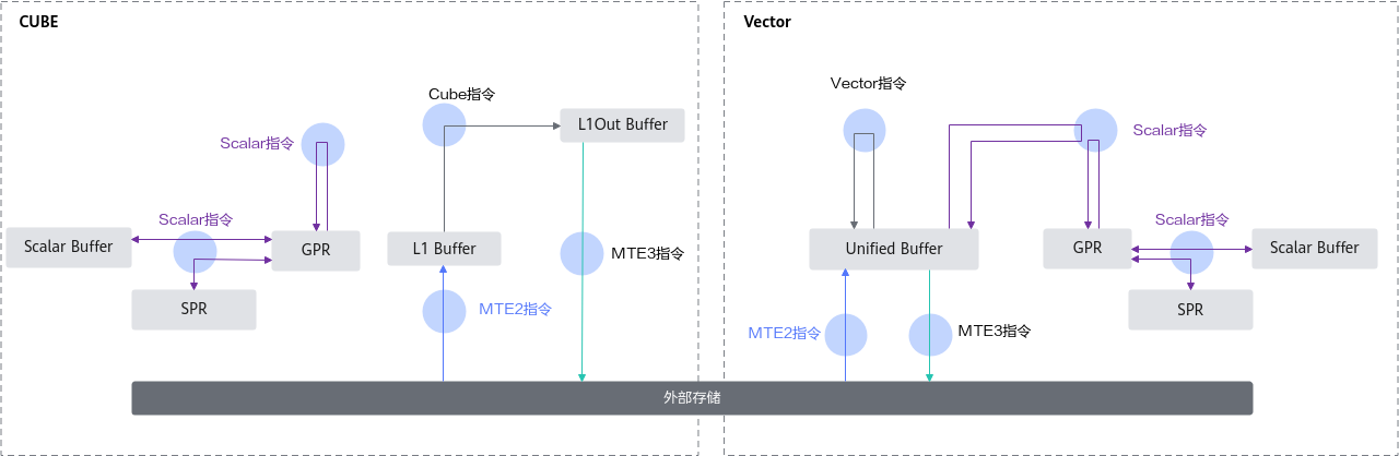 AI Core中的存储单元与计算单元通过精心的设计实现高效协同。每种存储单元只能使用特定的指令访问,存储及指令之间的关系如下:
